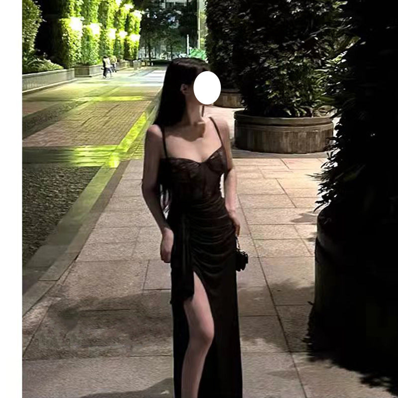 Dadizhimu Style Temperament Dress Dress Retro Fish Bone Niche Design Slings Long Slim Slim Thin Open Fork Sexy Bag