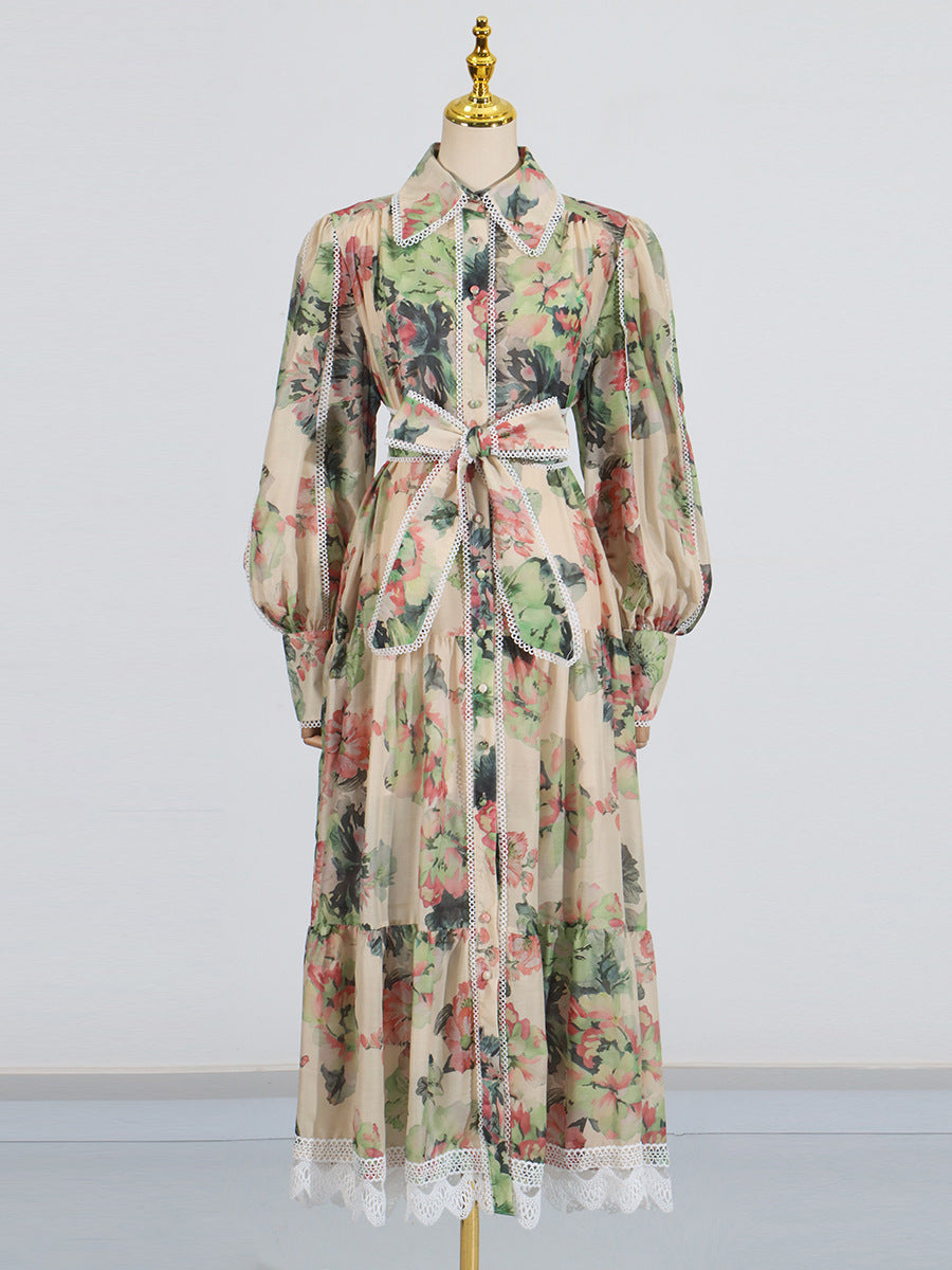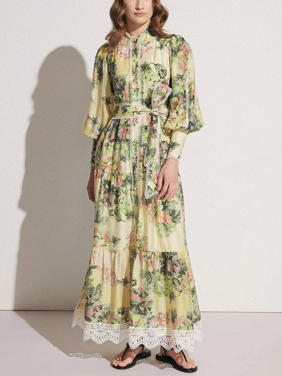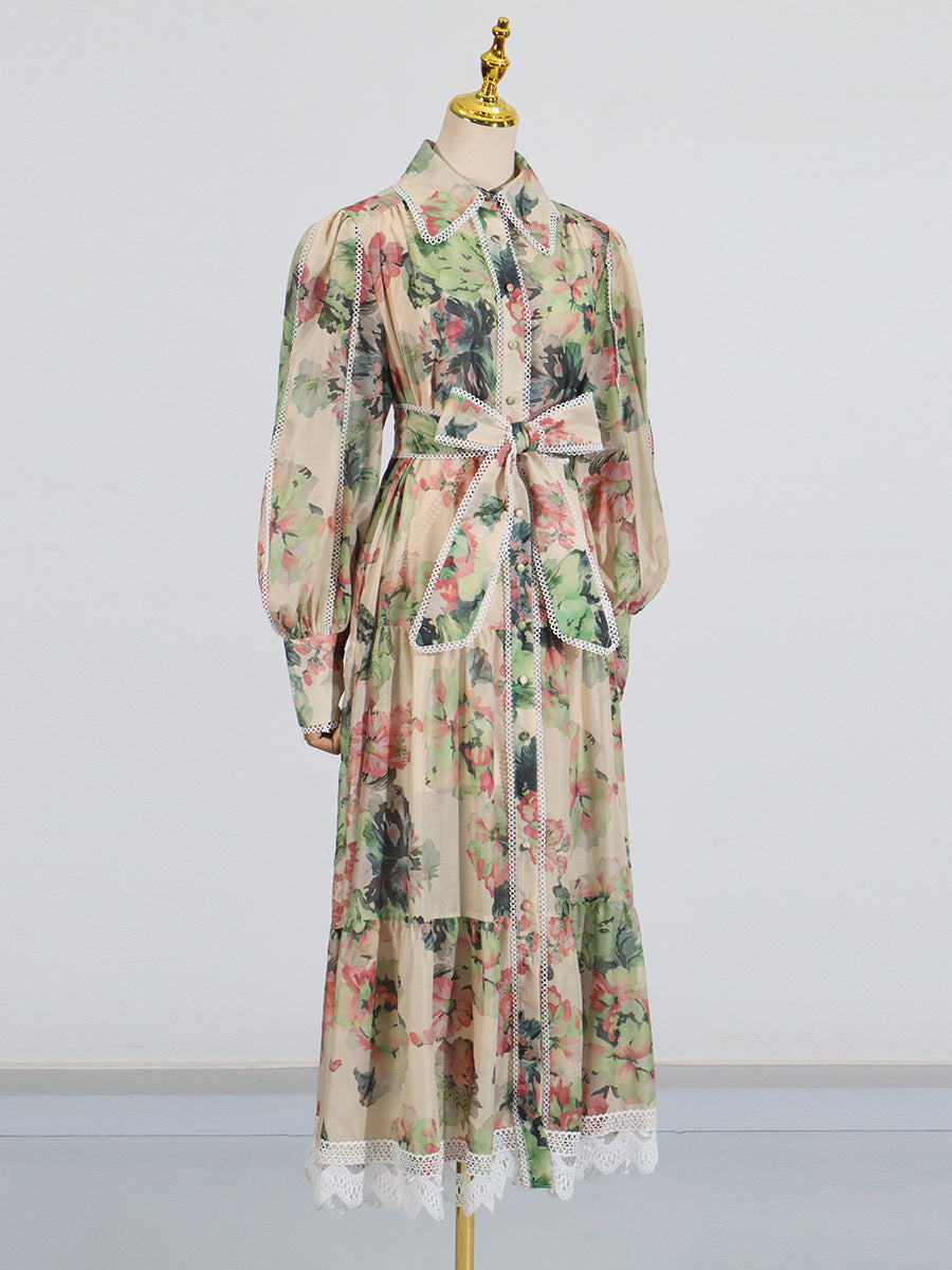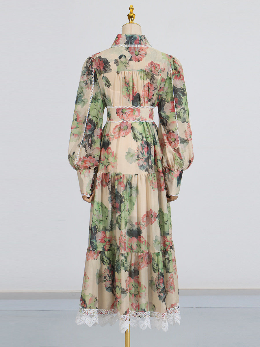 Dadizhimu Style Ticed With Waist Thin Collar Dress 2025 New Retro Print Design Long Dress Dress Women's Summer