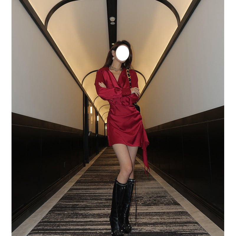 Dadizhimu V-Necked Waist-Sleeve Shirt Dress Dress Dress Female Pure Ass Skirt
