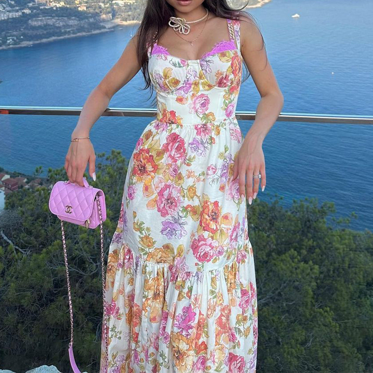 Dadizhimu Women's New Dress Dress Sweet Spicy Wind Chopped Flowers In The Long Dress Bare Sleeveless Sling Dress Women's Summer
