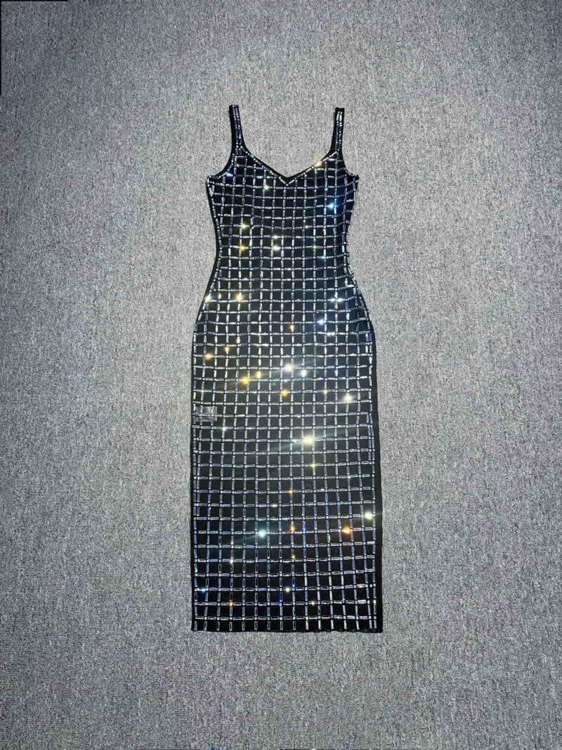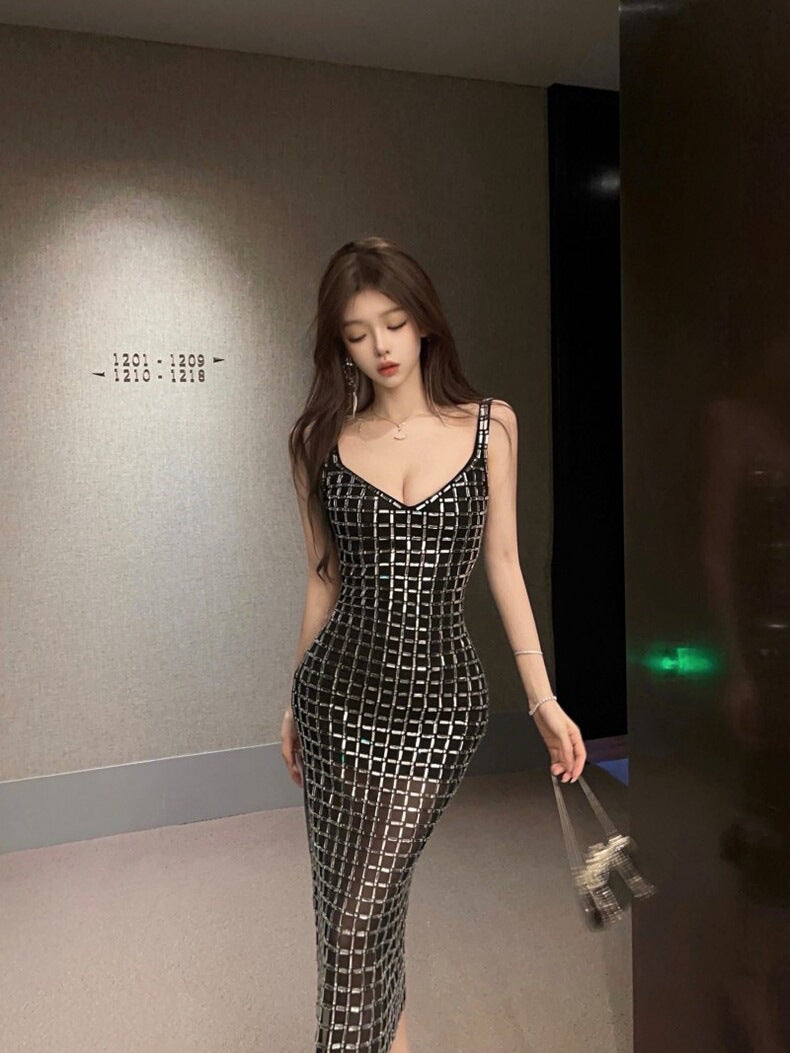 Dadizhimu Women's Nude Flash-Colored Back Light Luxury Party Birthday Sexy Dress Hanging Dress
