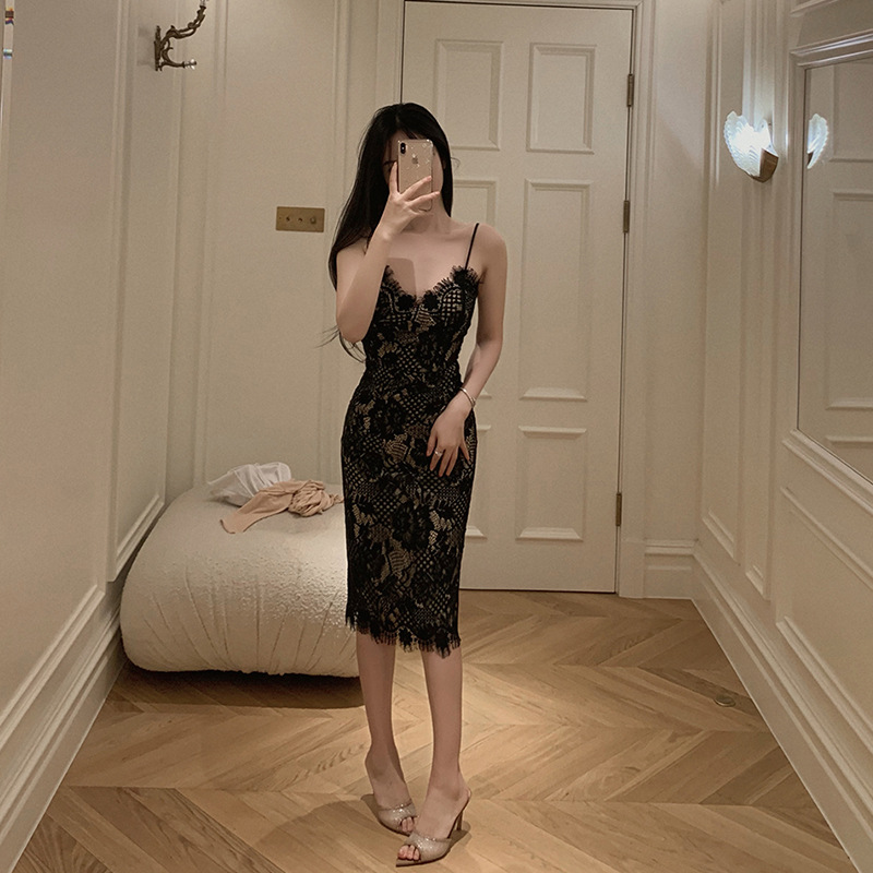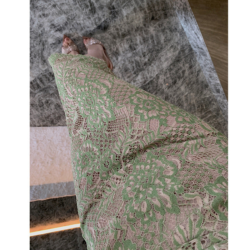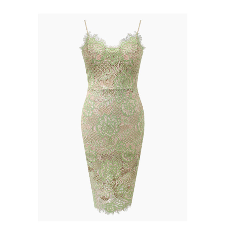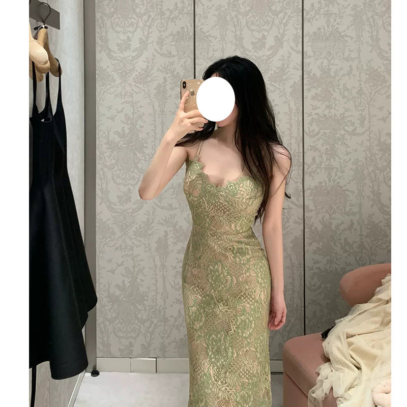 Dadizhimu Elegant Apricot Green Lace Dress Sling Dress Femininity Small Design Banquet Dress Dress With Hip Dress