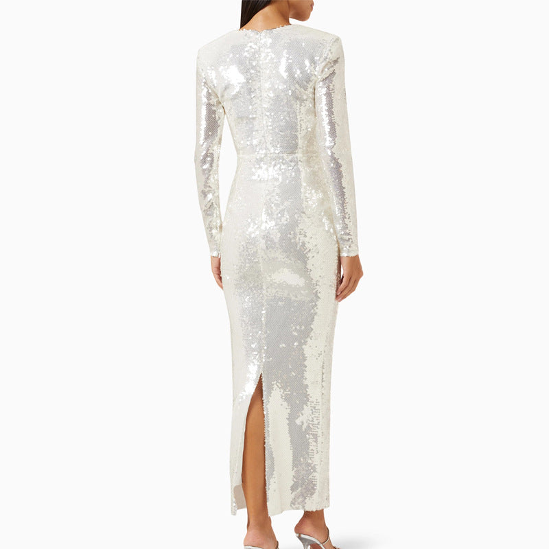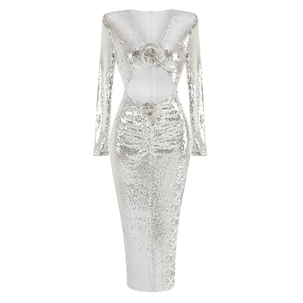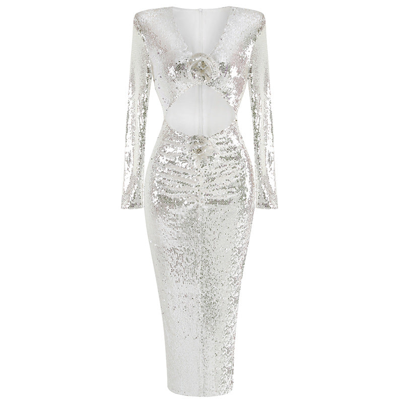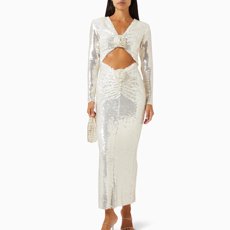 Dadizhimu Fashion Sexy Sleek V-Neck Dress Woman Navel Decorating Flower Dress Dress Dress Long