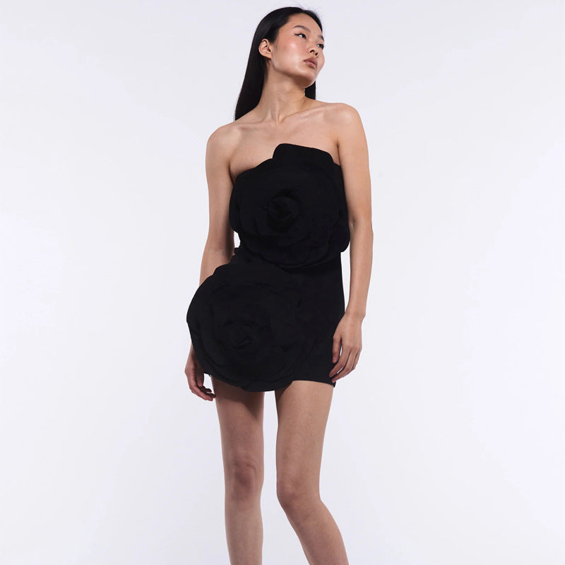Dadizhimu Sexy Red Breast Trim High-End Temperament Decorative Three-Dimensional Flower Party Dress