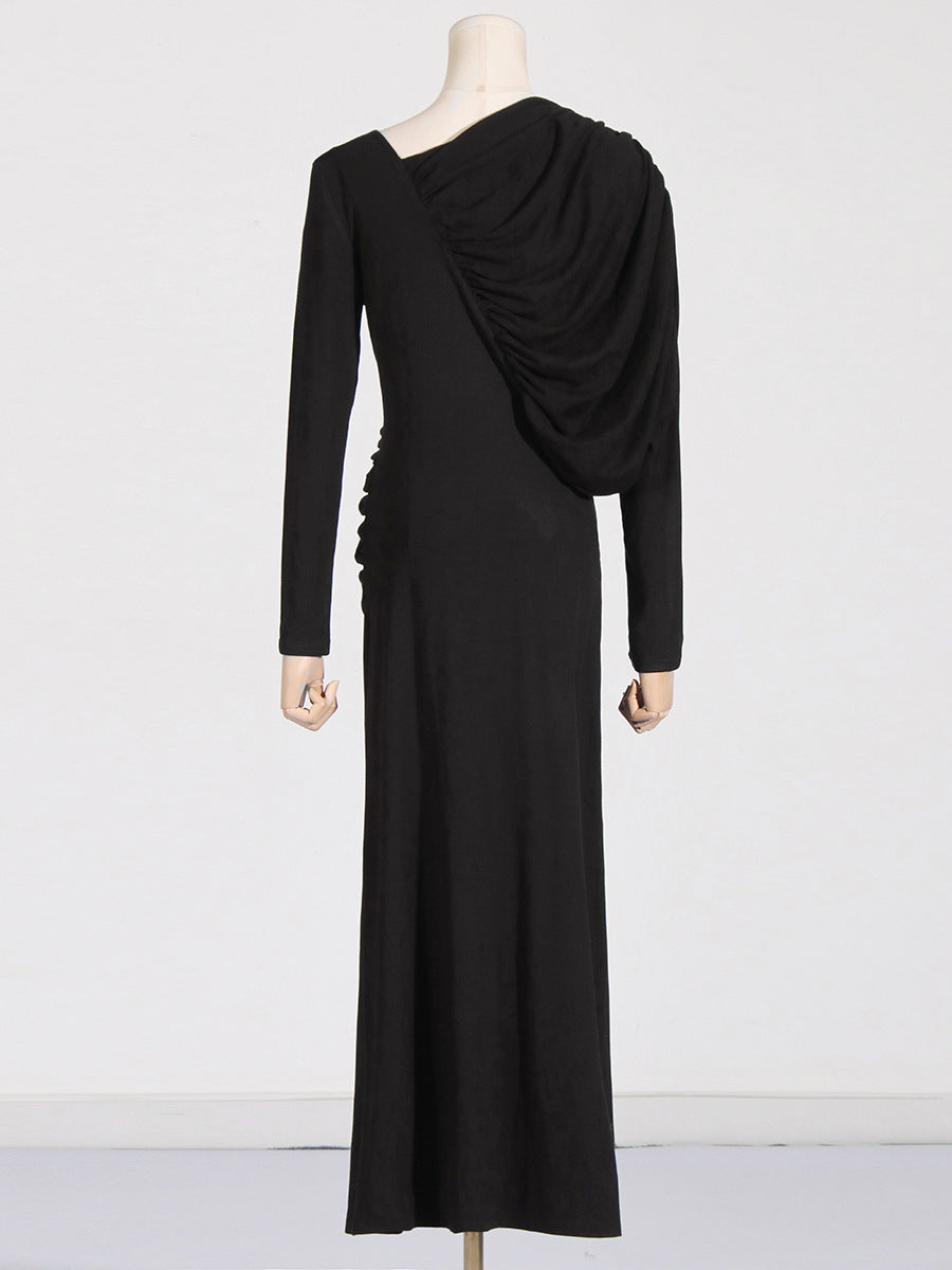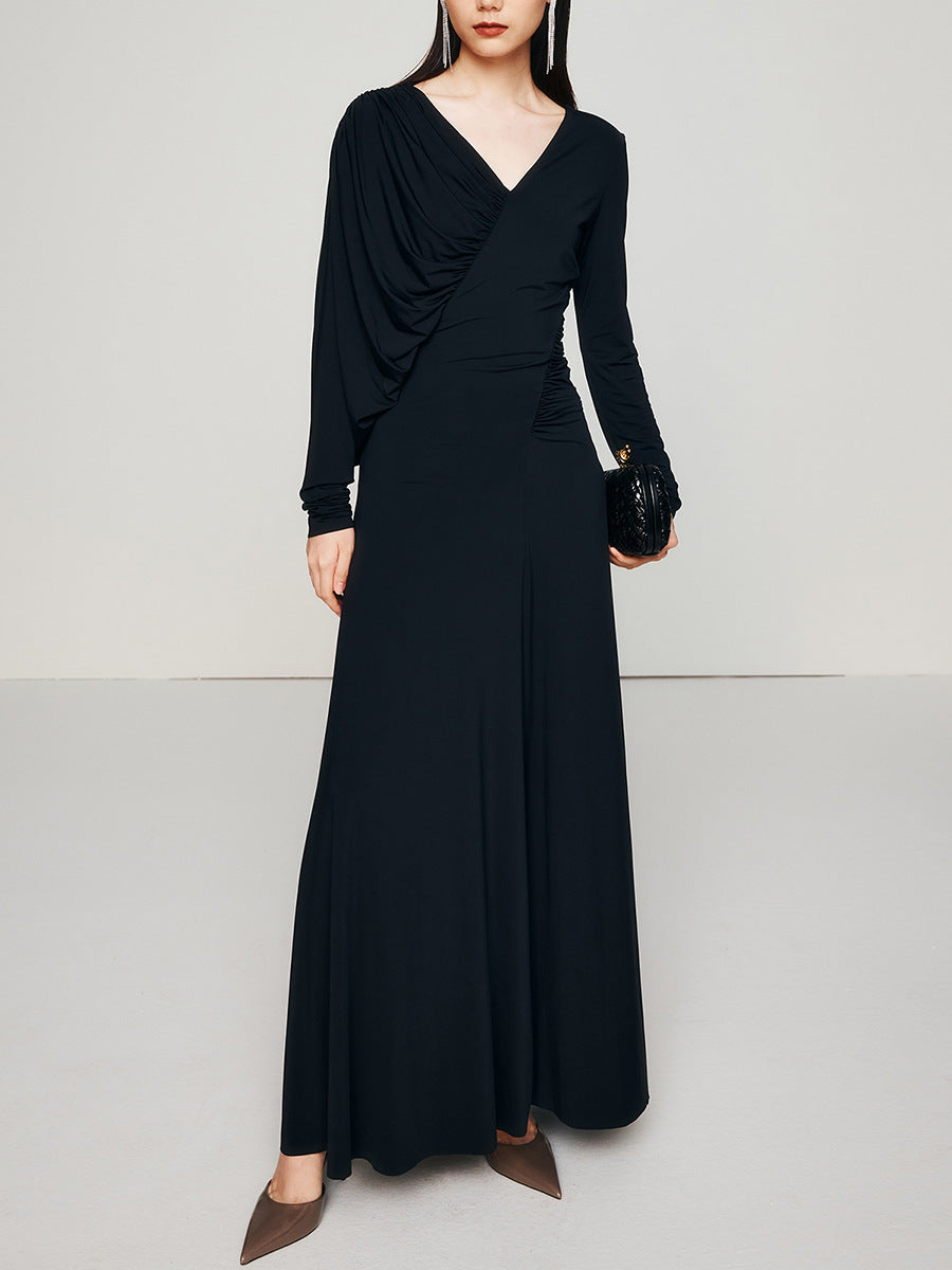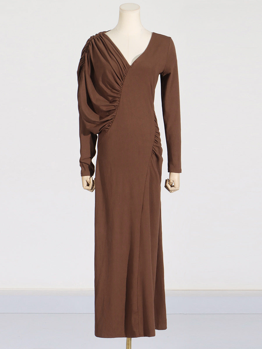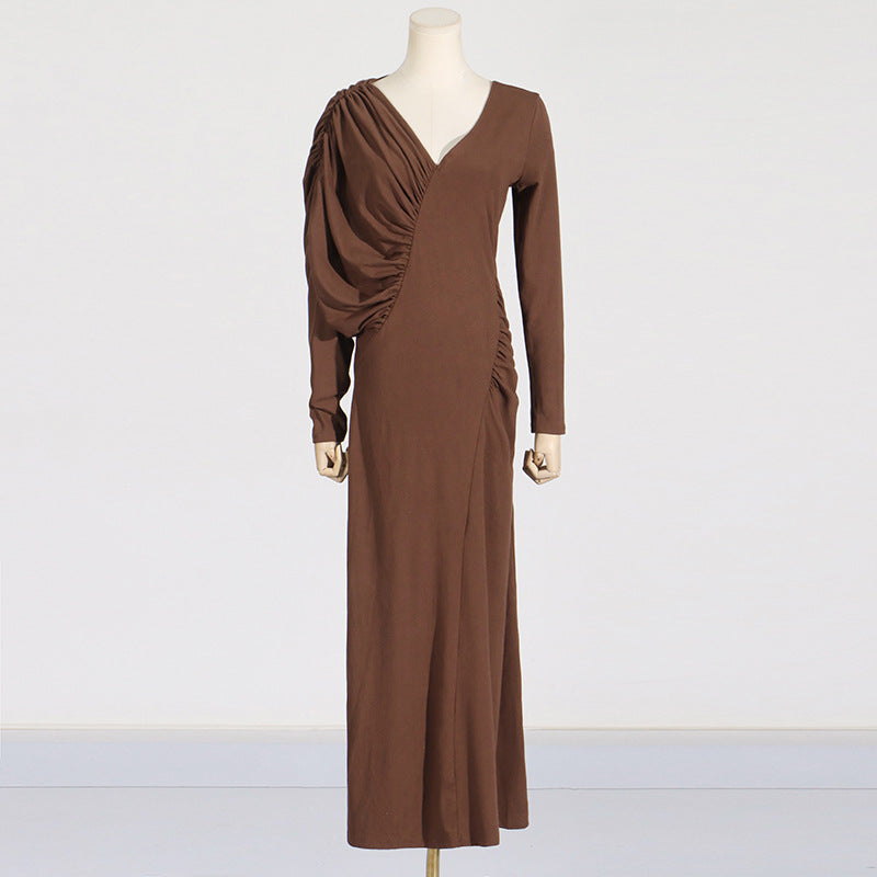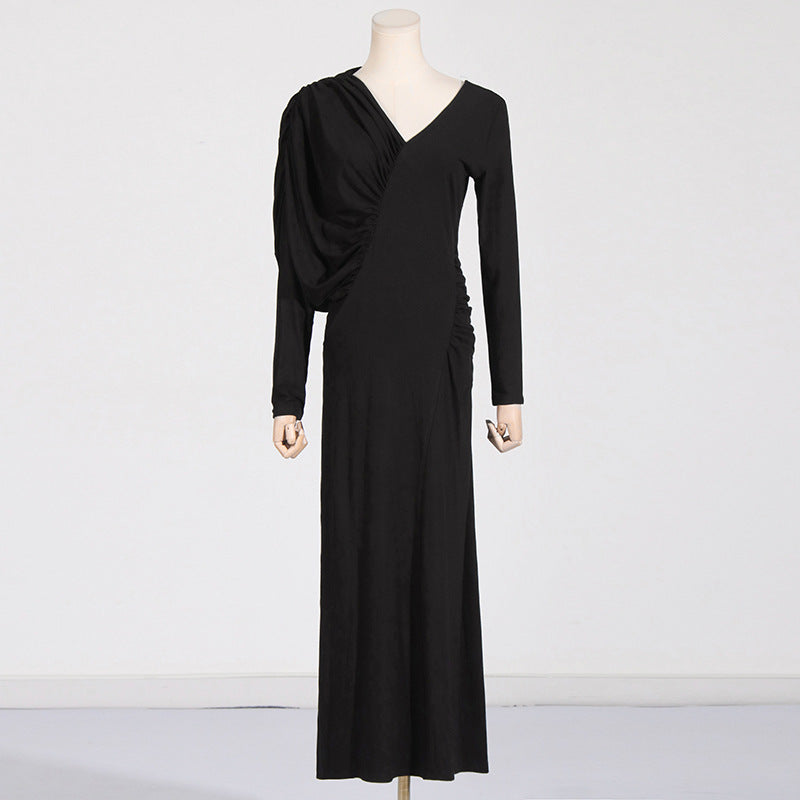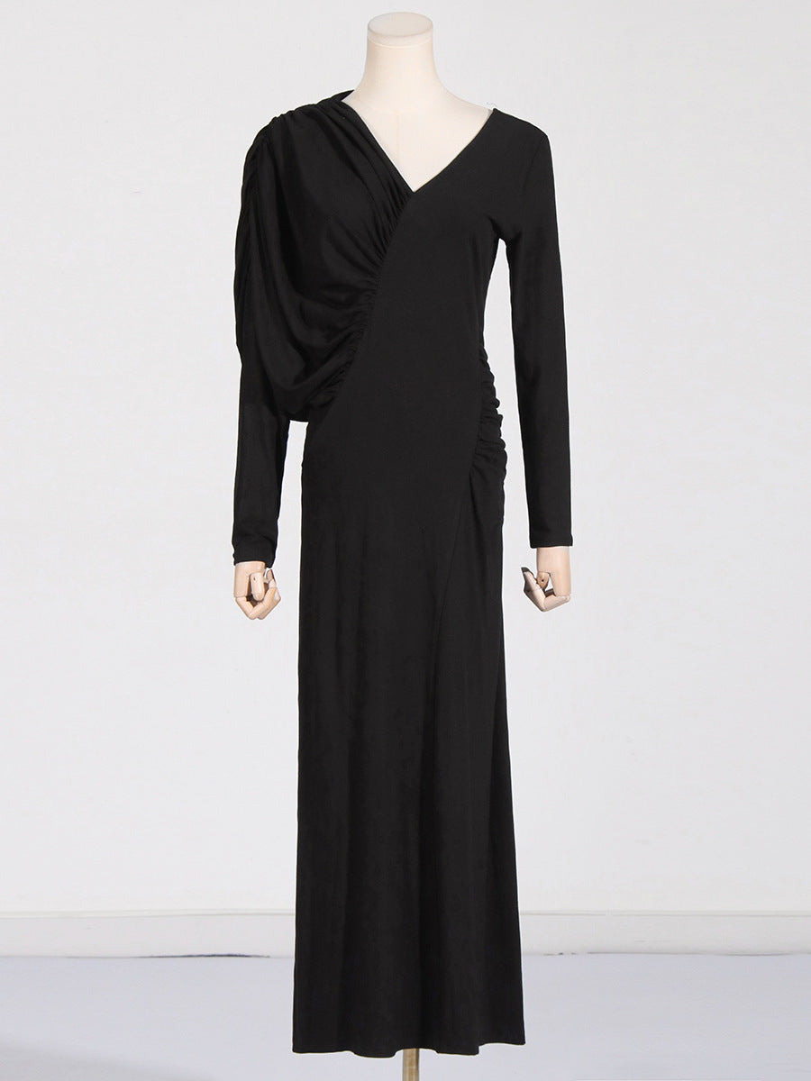 Dadizhimu Temperament Asymmetric Slimming Dress 2025 New V-Neck Design Pressure Fold Solid Color Dress Woman