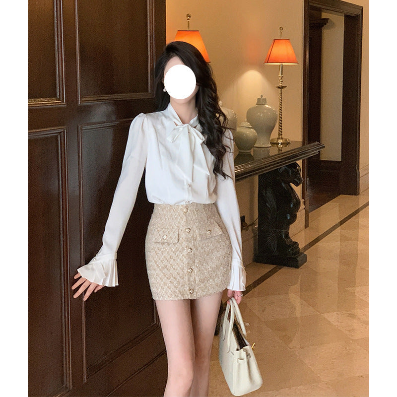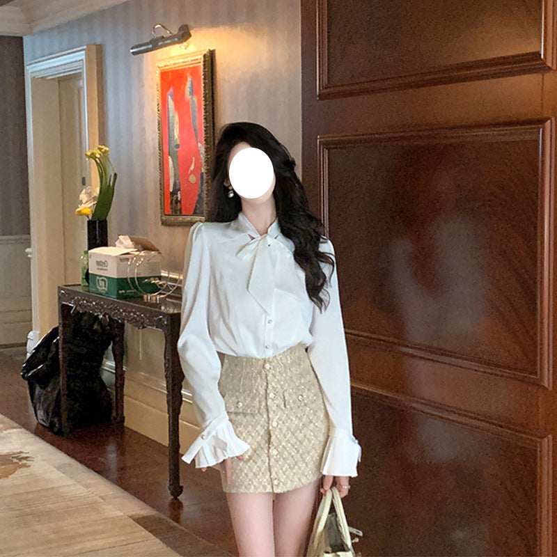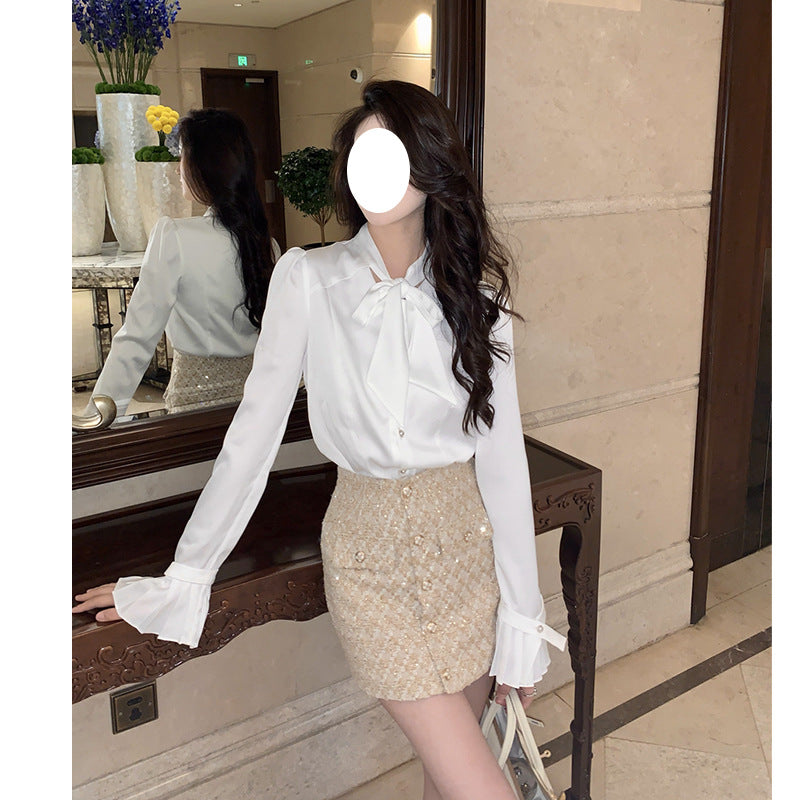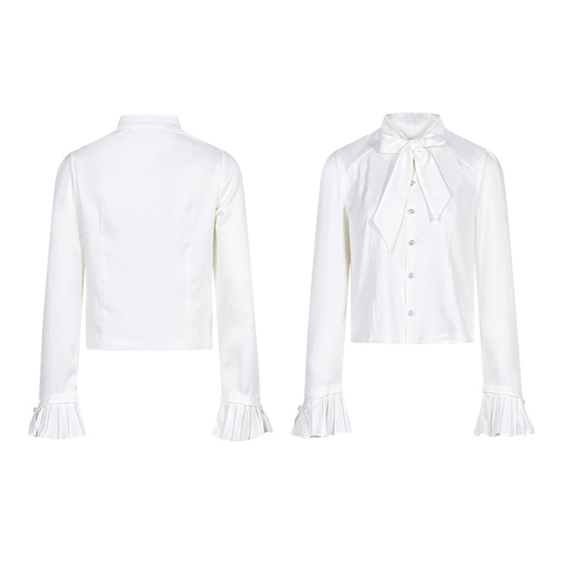 Dadizhimu Temperament Bow Elegant Romantic French-Style Sintered White Shirt Spring And Autumn Bottom V Collar Long-Sleeved Top Woman