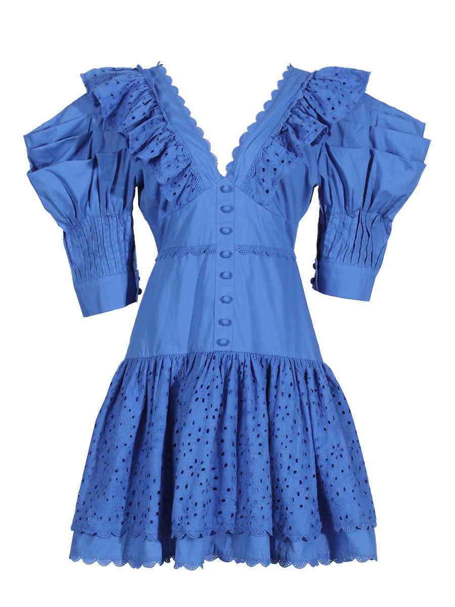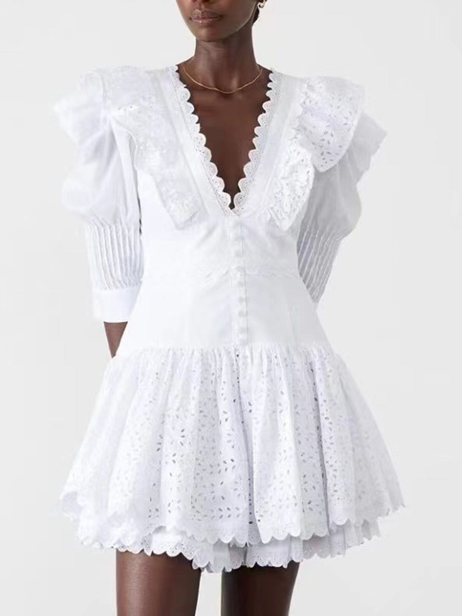 Dadizhimu Court Style V-Neck Bubble Sleeve Dress 2025 New Lace Embroidery To Collect Thin Short Dress Woman