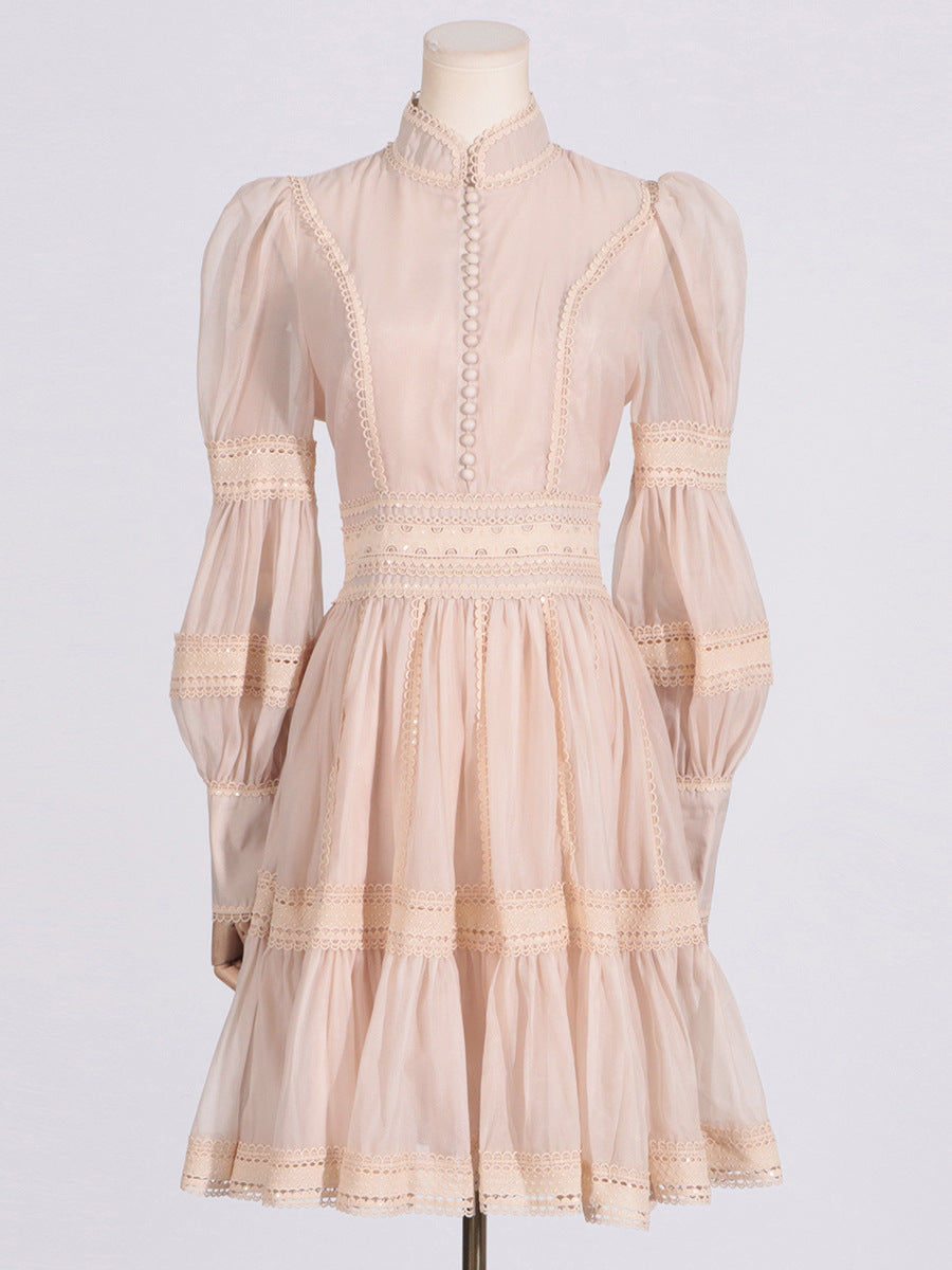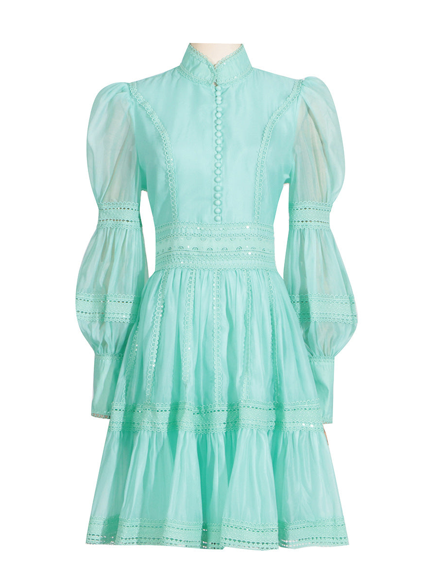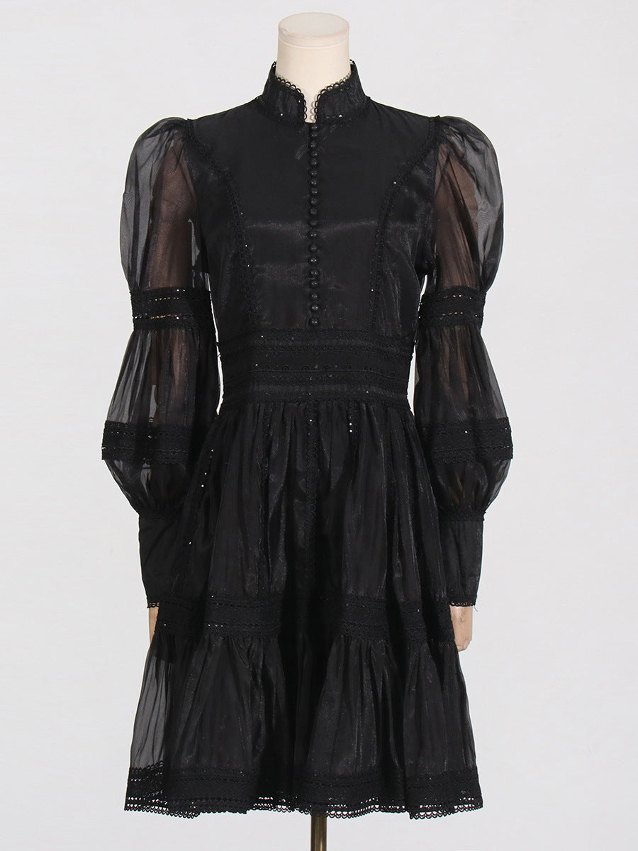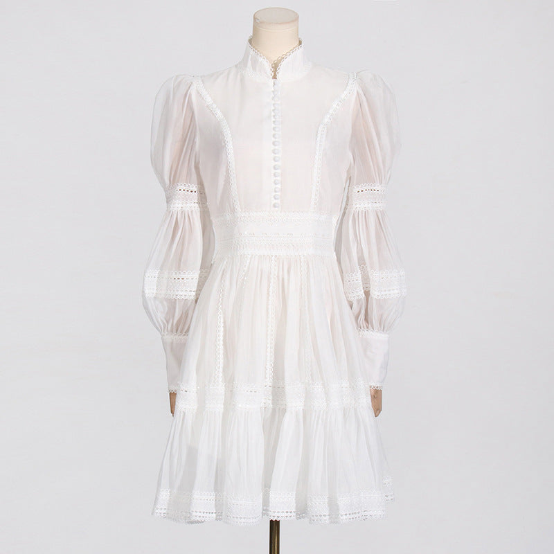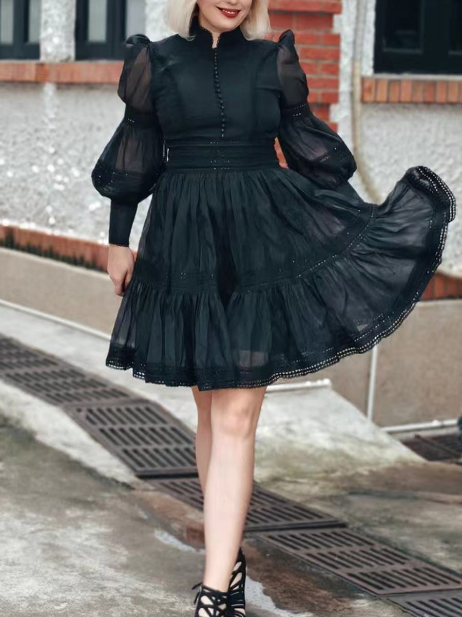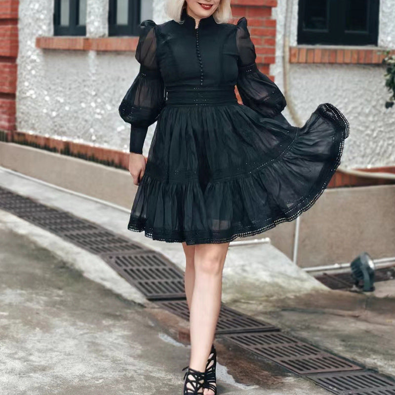 Dadizhimu Retro High-End Short Dress 2025 Summer New Fashion Collar Lantern Sleeve Mesh Waist Dress Dress Woman