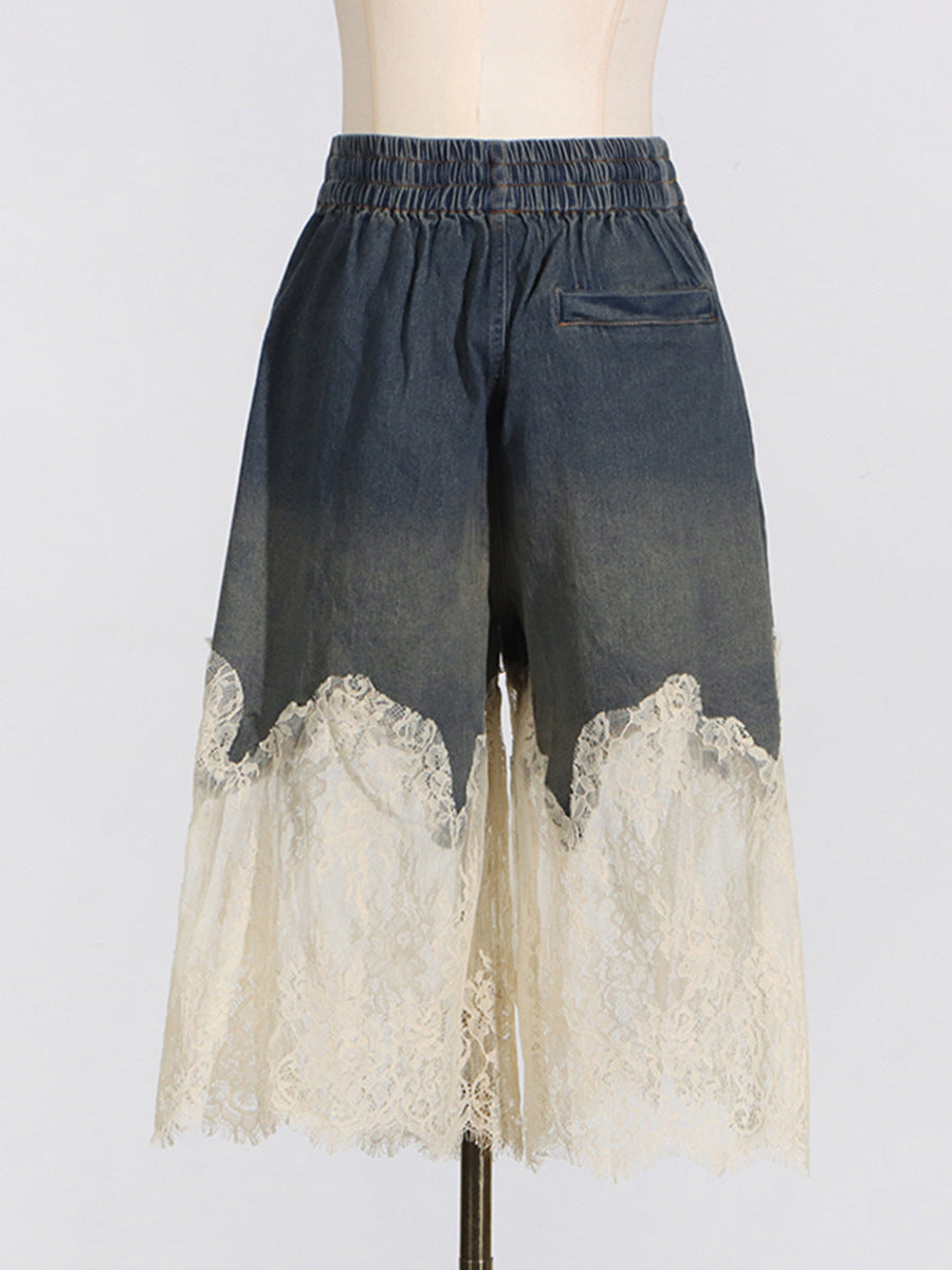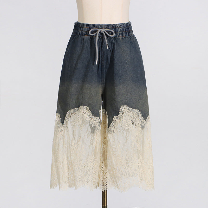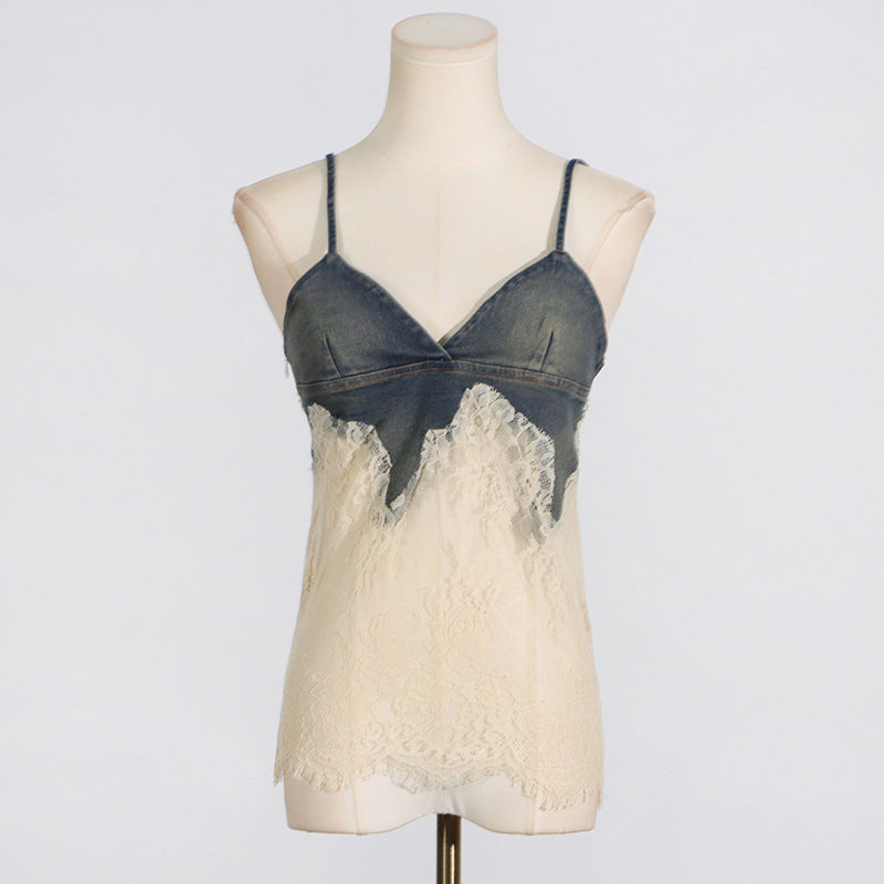 Dadizhimu Summer New Lace Splicing Sexy Sling + Fashion High-End Denim Shorts Two-Piece Set Of Women