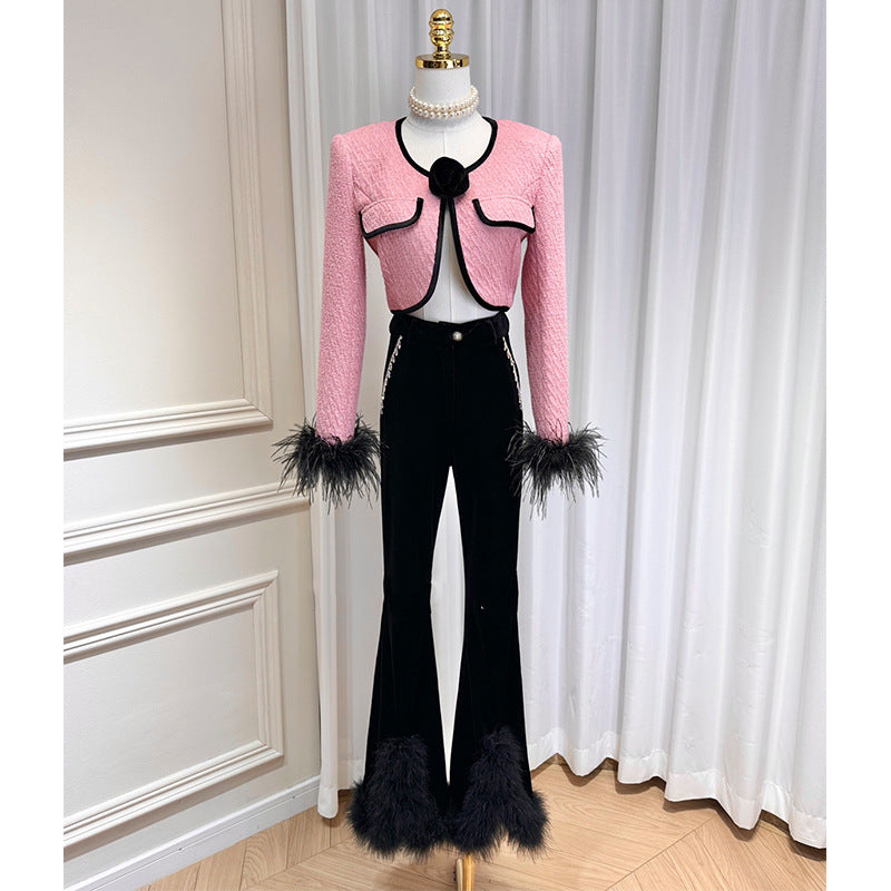 Dadizhimu Wind Rose Flower Brooch Short Ostrich Coat High Waist Water Drill Chain Velvet Trumpet Trousers