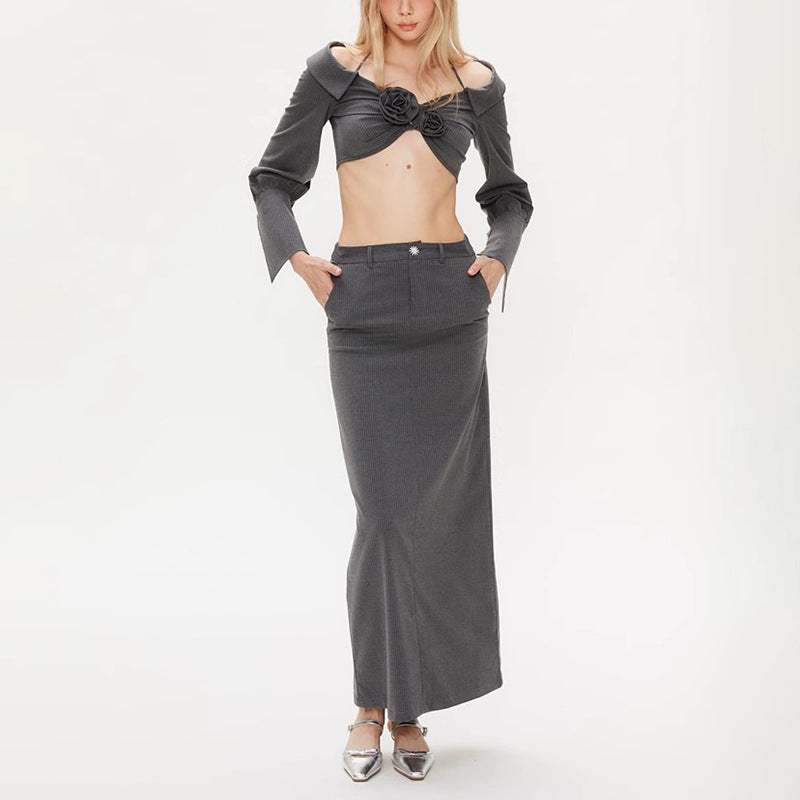 Dadizhimu Wind Two Sets 2025 New One-Word Shoulder Hanging Neck Short Top + Open Skirt Dress Suit Woman