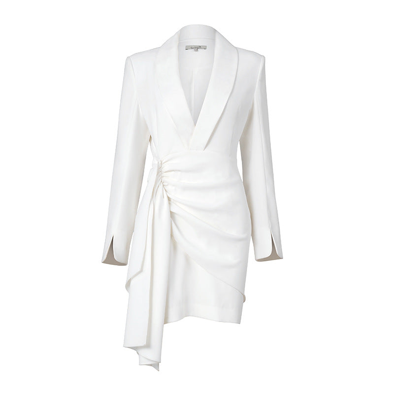 Dadizhimu A White V-Neck Banquet French Famous Style Dress Girded Long Sleeve Skirt