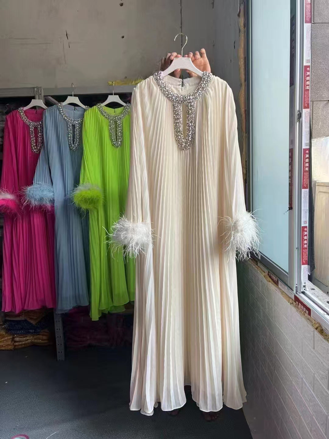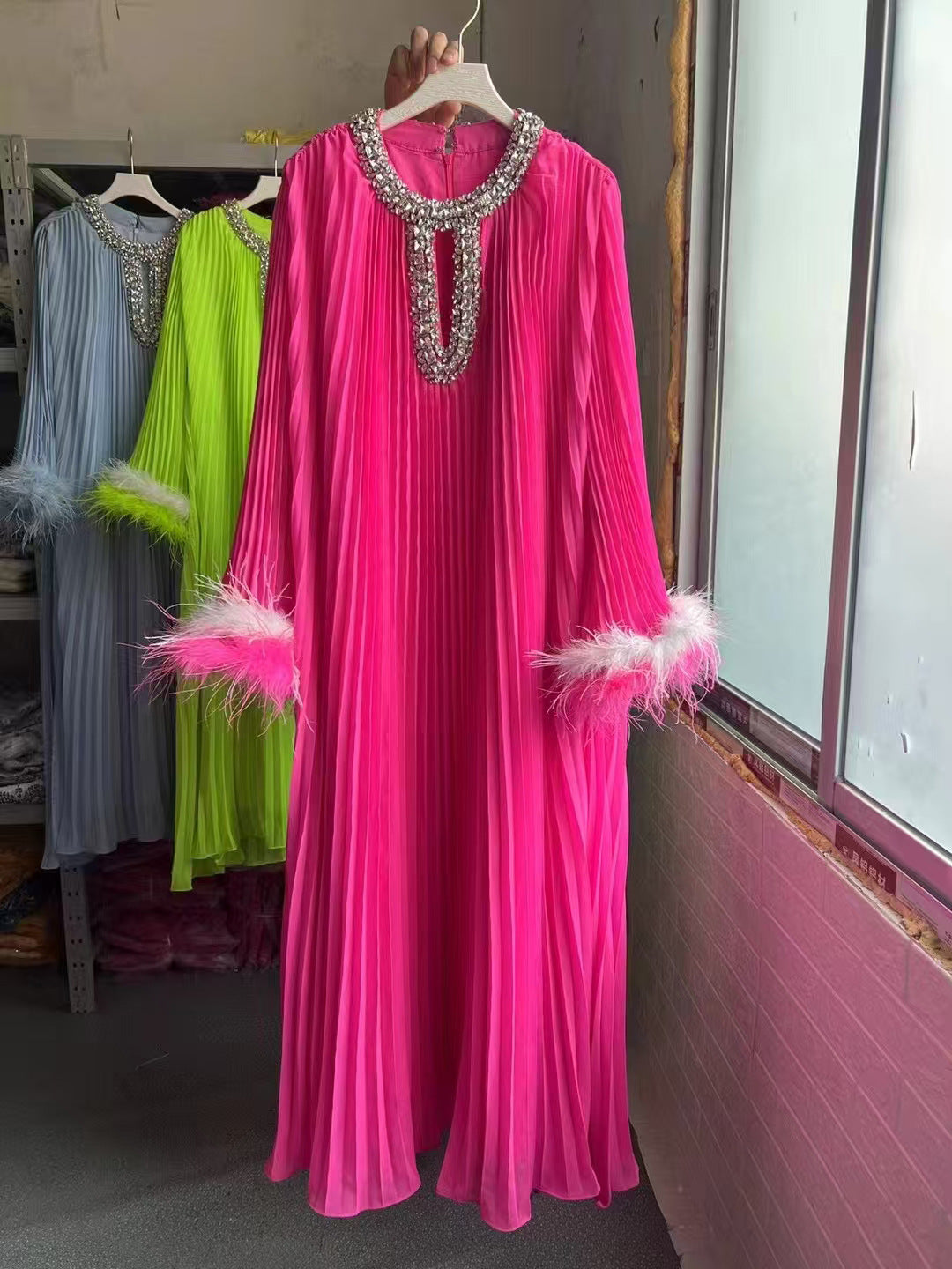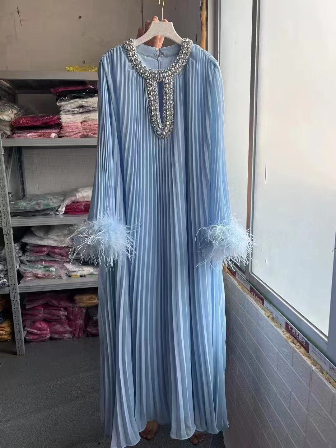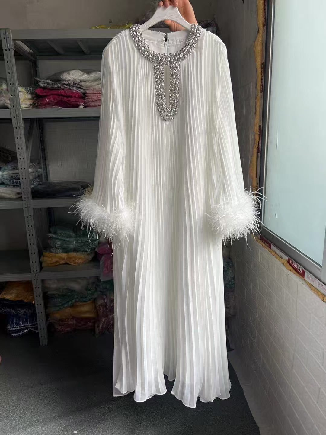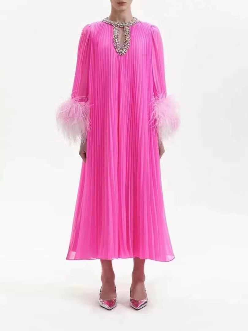 Dadizhimu And Autumn 2024 New Round-Necked Nail Pearl Feather Cuffs 100-Fold Loose Mid-Long Dress Dress Dress Women's Leisure