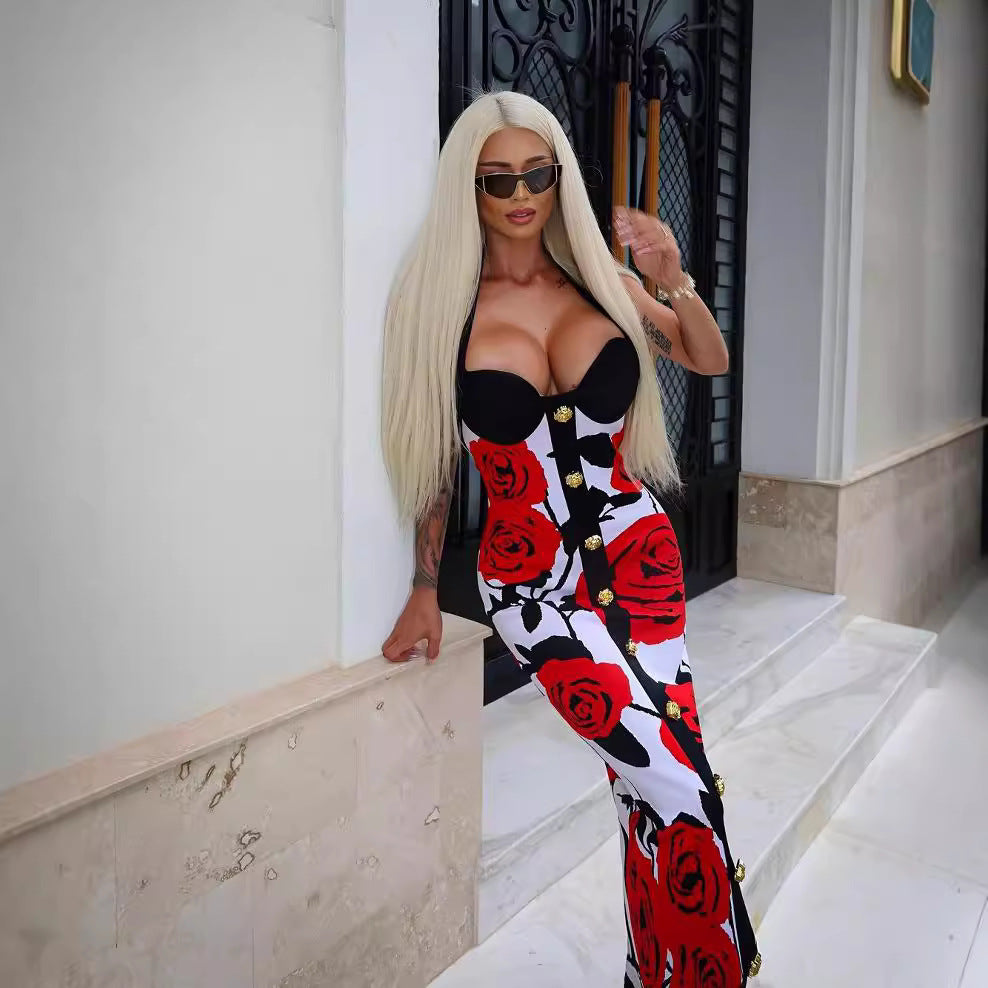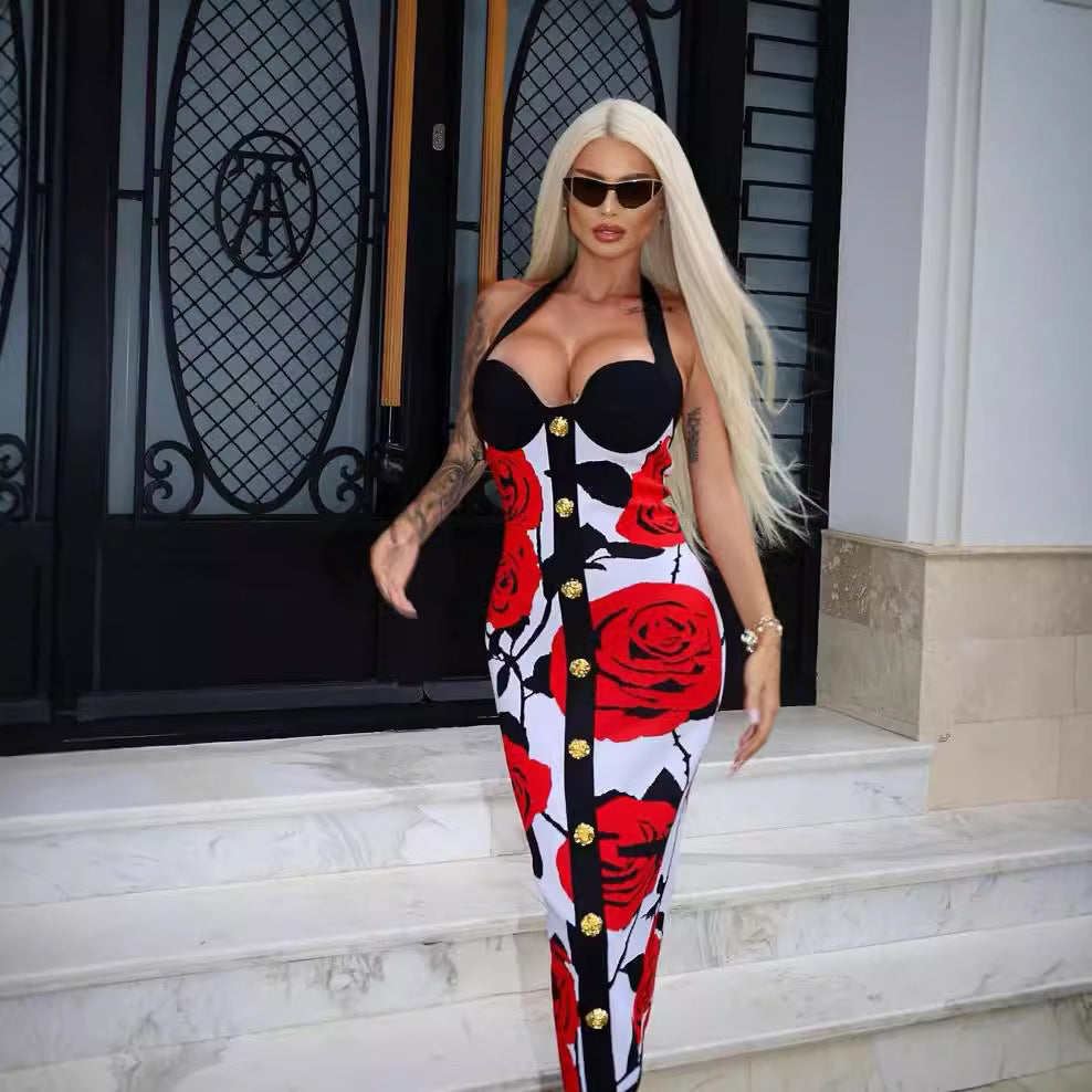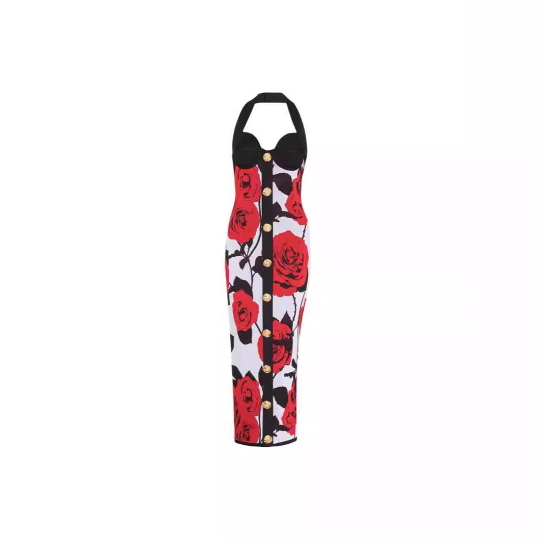 Dadizhimu Boutique Thigh Dress Hanging Neck-Lender Rose Slimming Long Dress