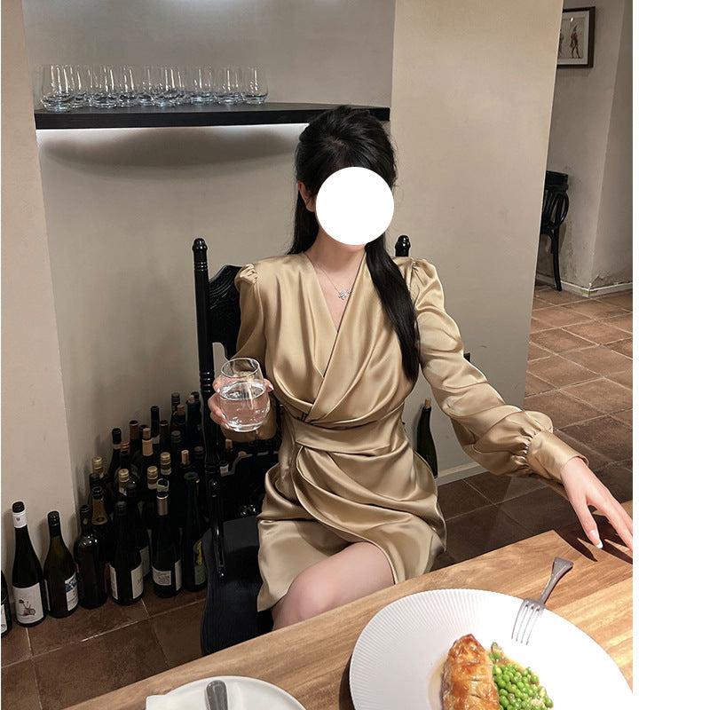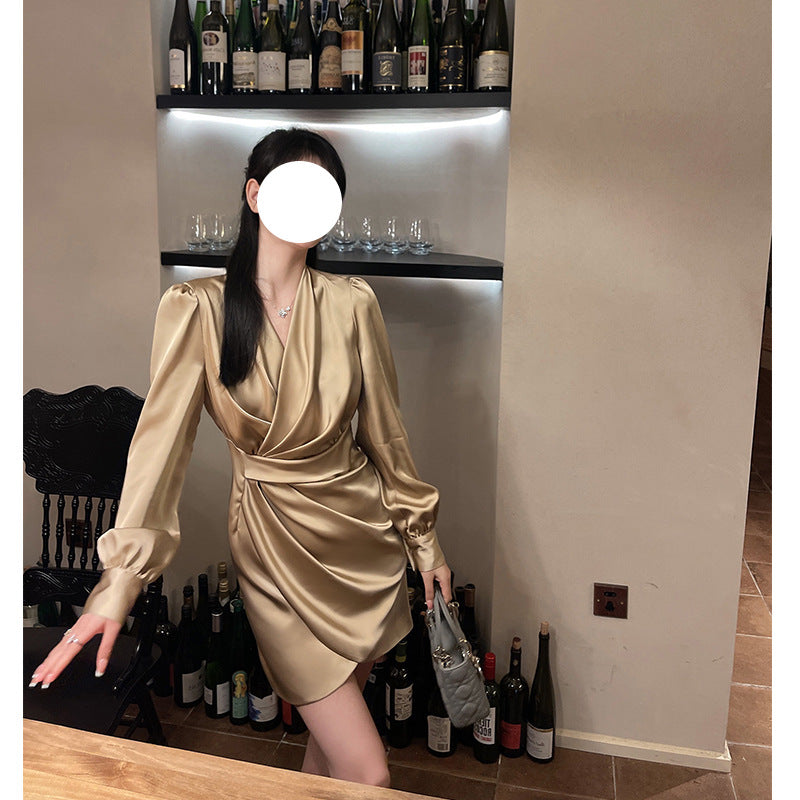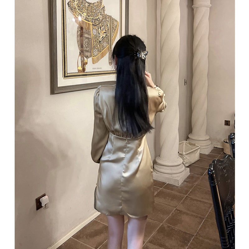 Dadizhimu Collar Long Sleeves Golden Lilyded Shiny Dress Femininity Folds Thin-Buttoned Dress