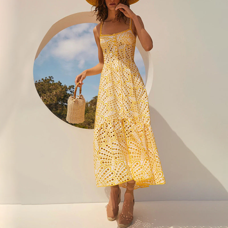 Dadizhimu Dress 2025 New Hollow Embroidery Open Fork High-End Feeling Waist Long Sling Skirt Women's Clothing Tide