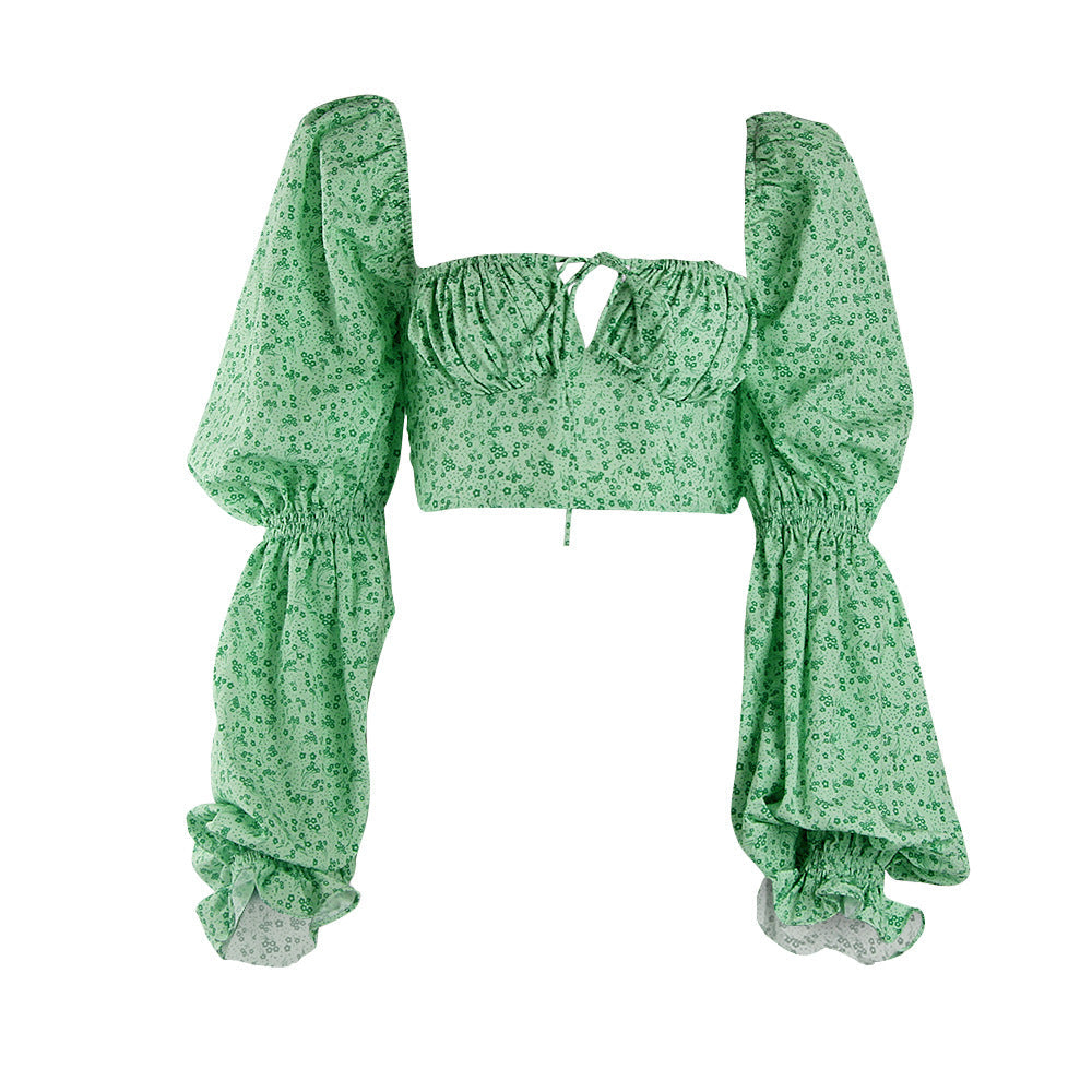 Dadizhimu Fashion Women's Clothing Collar Broken Flower Long-Sleeved Hollow Low-Breasted Tavel Trumpet Sleeve Top Lady