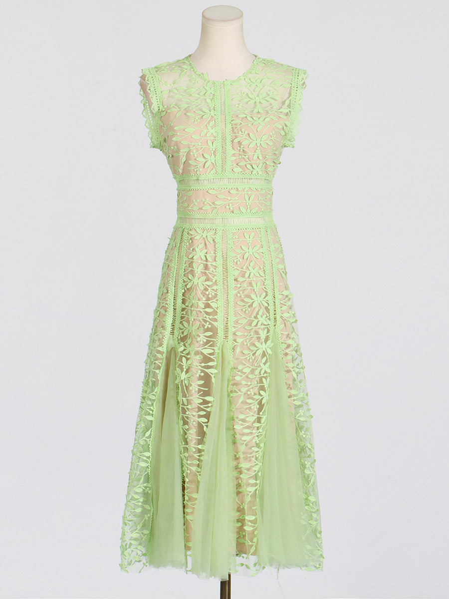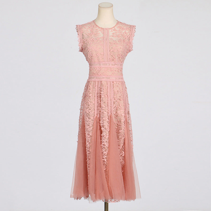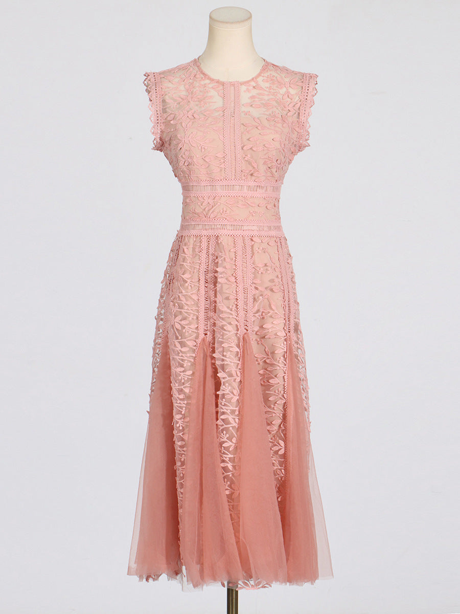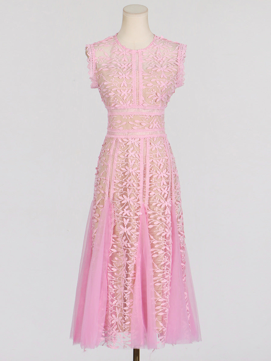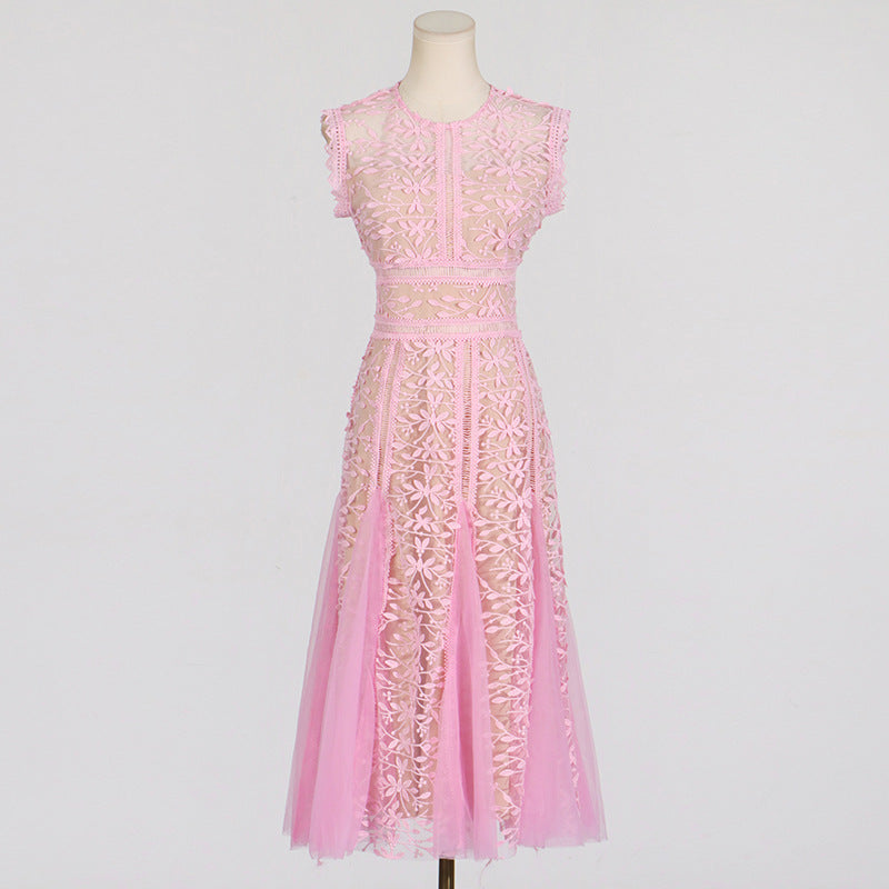 Dadizhimu Holiday Style Sleeveless Solid Color Dress 2025 New Design Yarn Net Embroidery Waist Thin Dress Woman