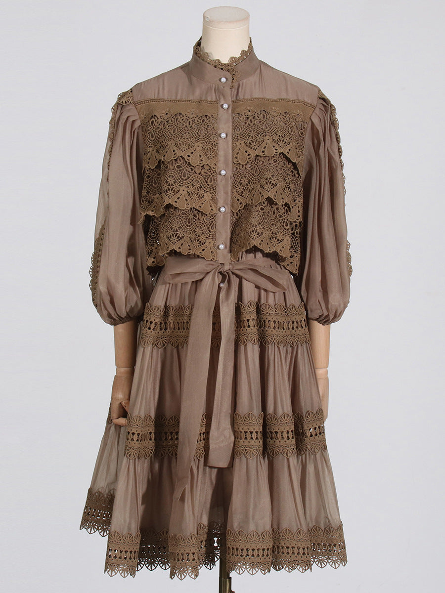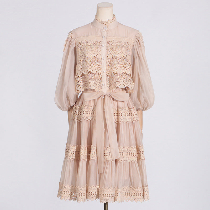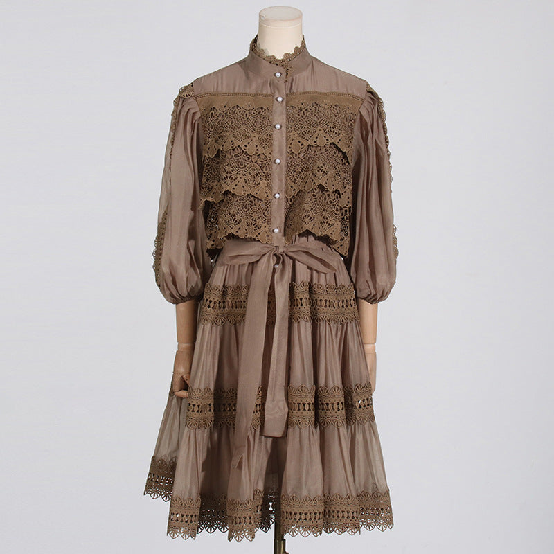 Dadizhimu Luxury Dress Women 2025 Spring New Hollow Lace Splicing Pearl Buckle Lantern Skirt