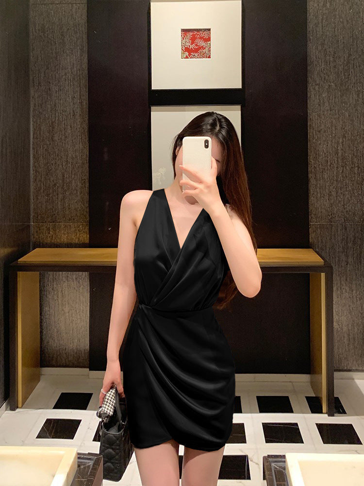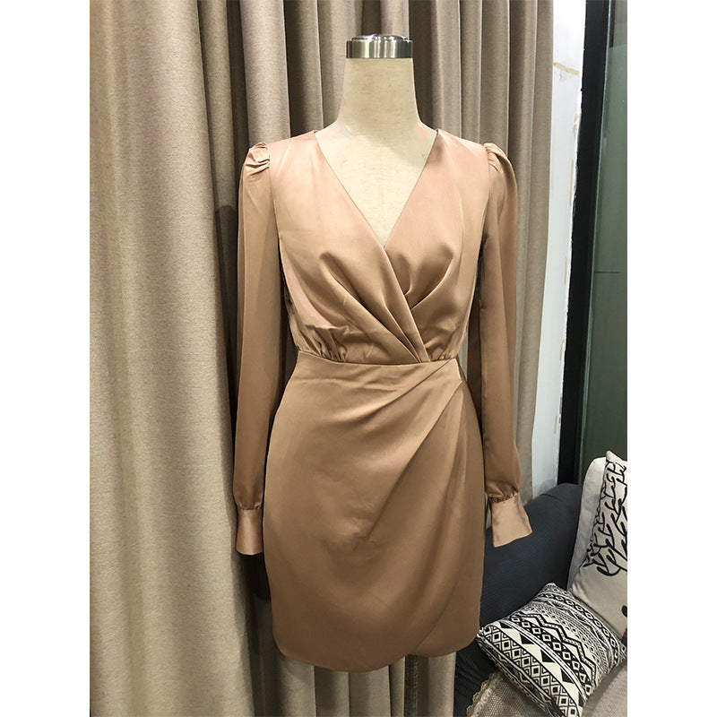 Dadizhimu New Long-Sleeved French Temperament Design Small Silk And Satin Noodle Folds To Collect Thin Dress Women