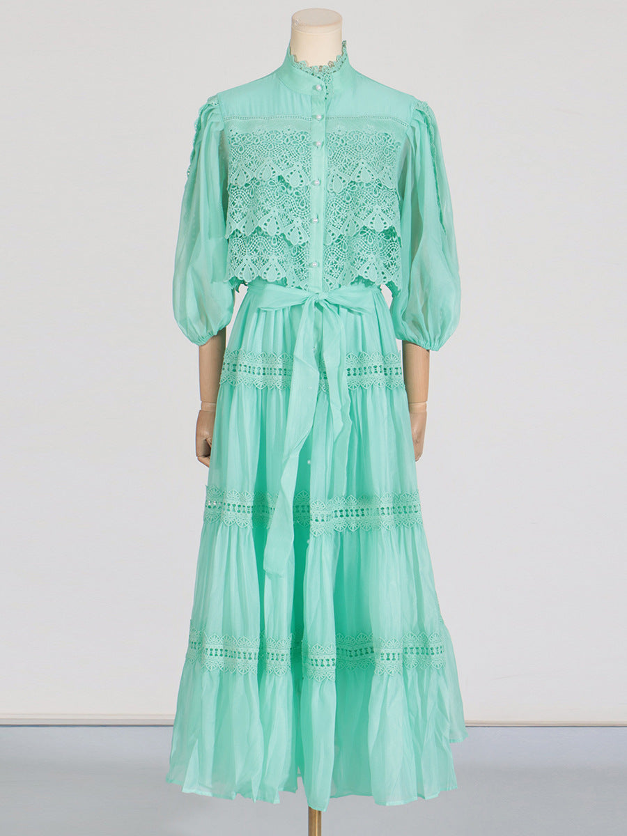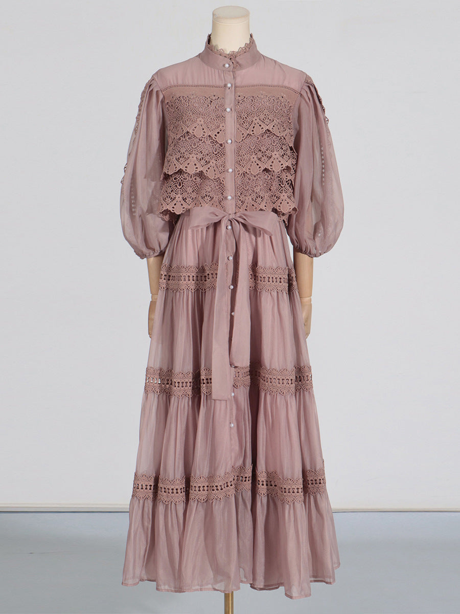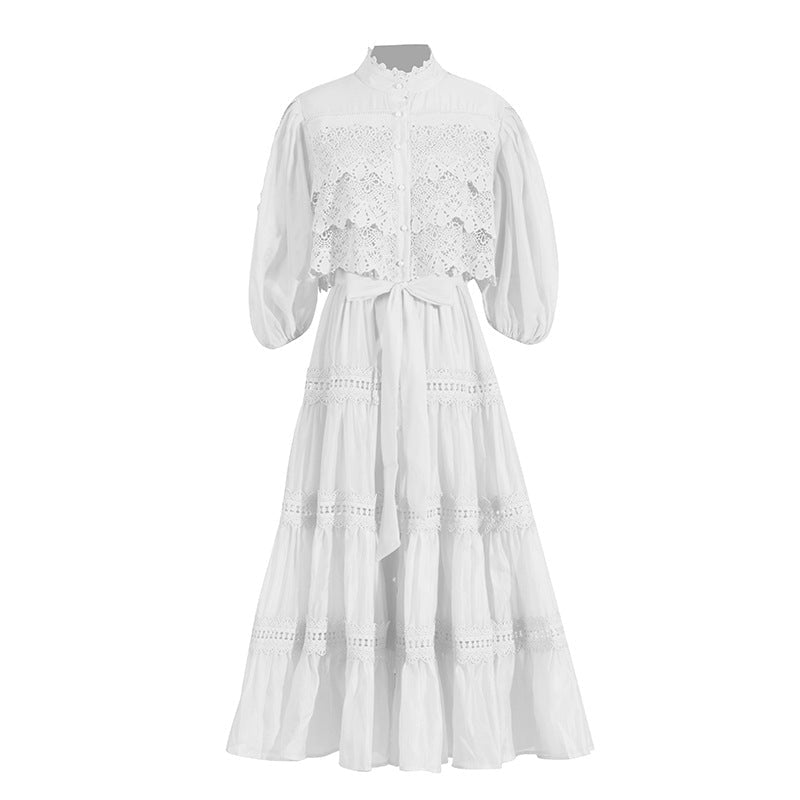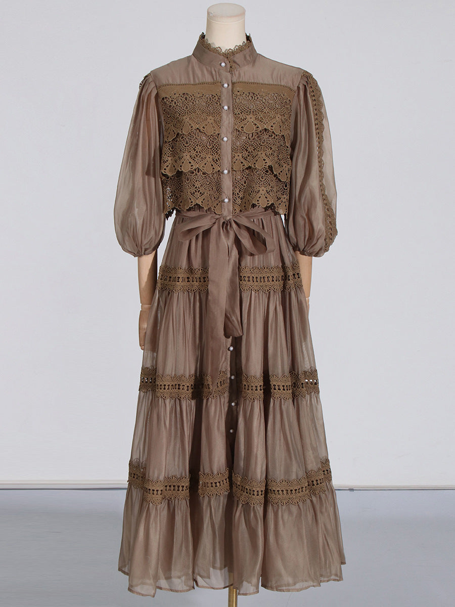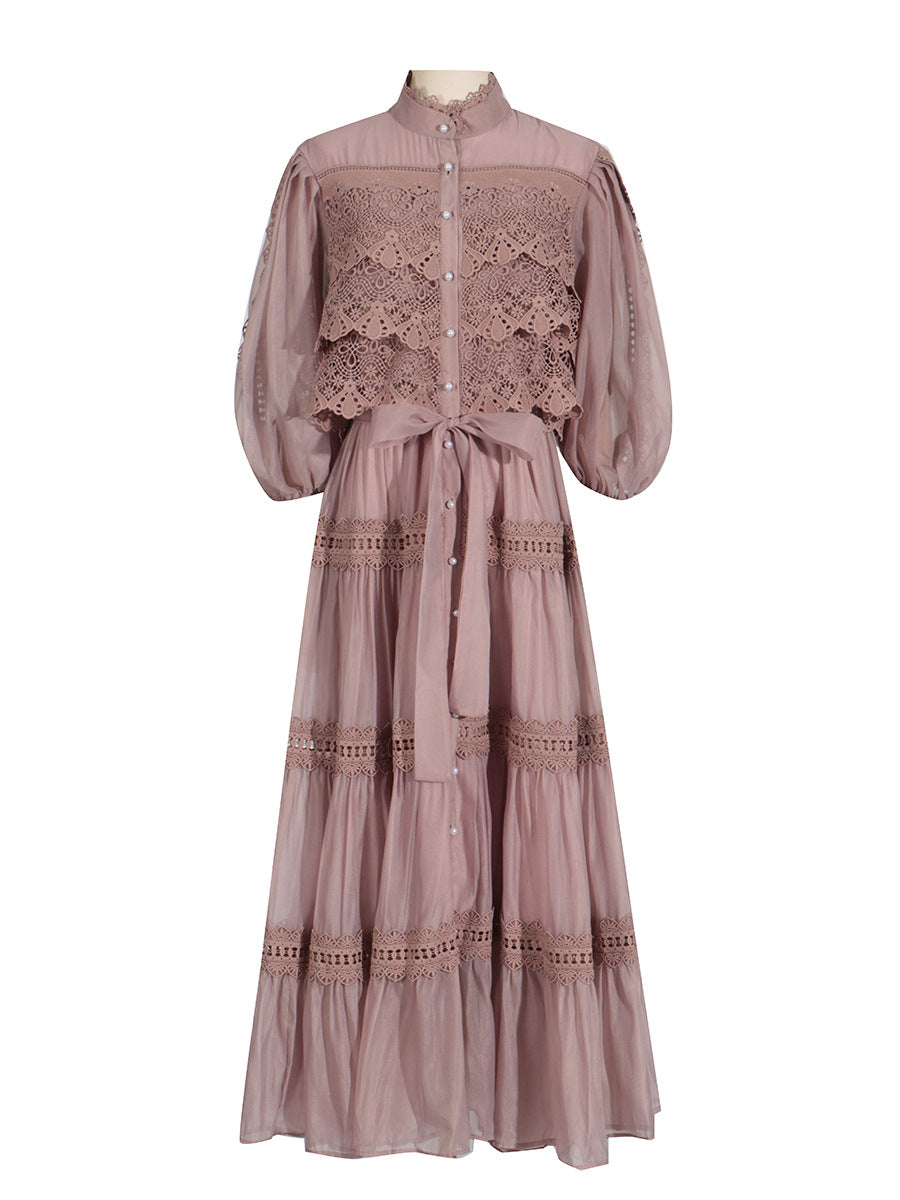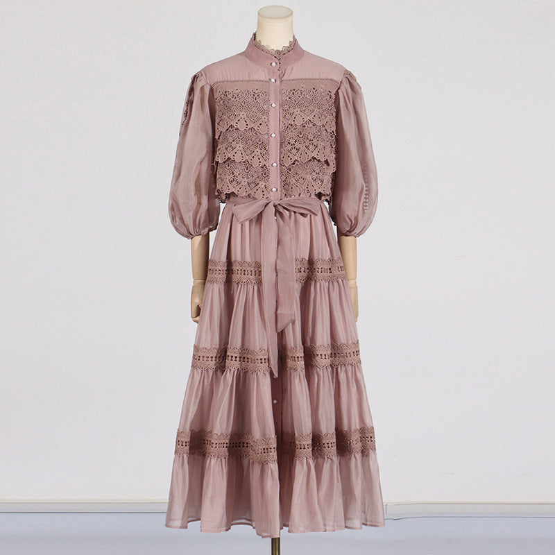 Dadizhimu Retro Style Long-Sleeved Dress Woman 2025 Spring New Splicing Hollow High-End Feeling Slimy Dress