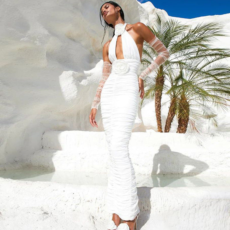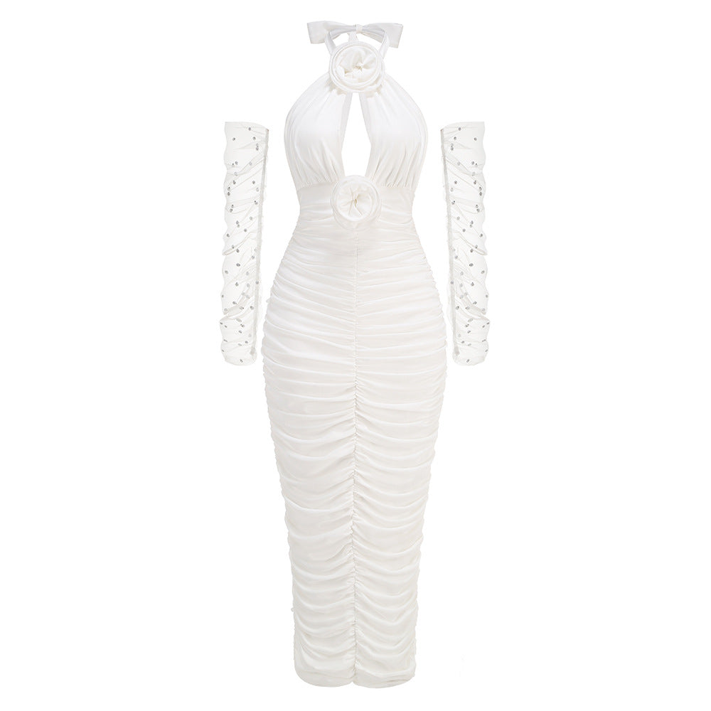 Dadizhimu Sexy Body Hanging Neck Dress Women Party Wearing Pearl Gloves Design Boutique Dress