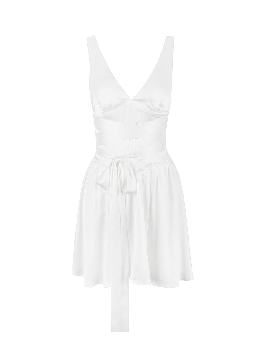 Dadizhimu Sexy Deep V Tie With Body-Caught White Short Dress Babes Sleeveless Dress Women's Pure Lust