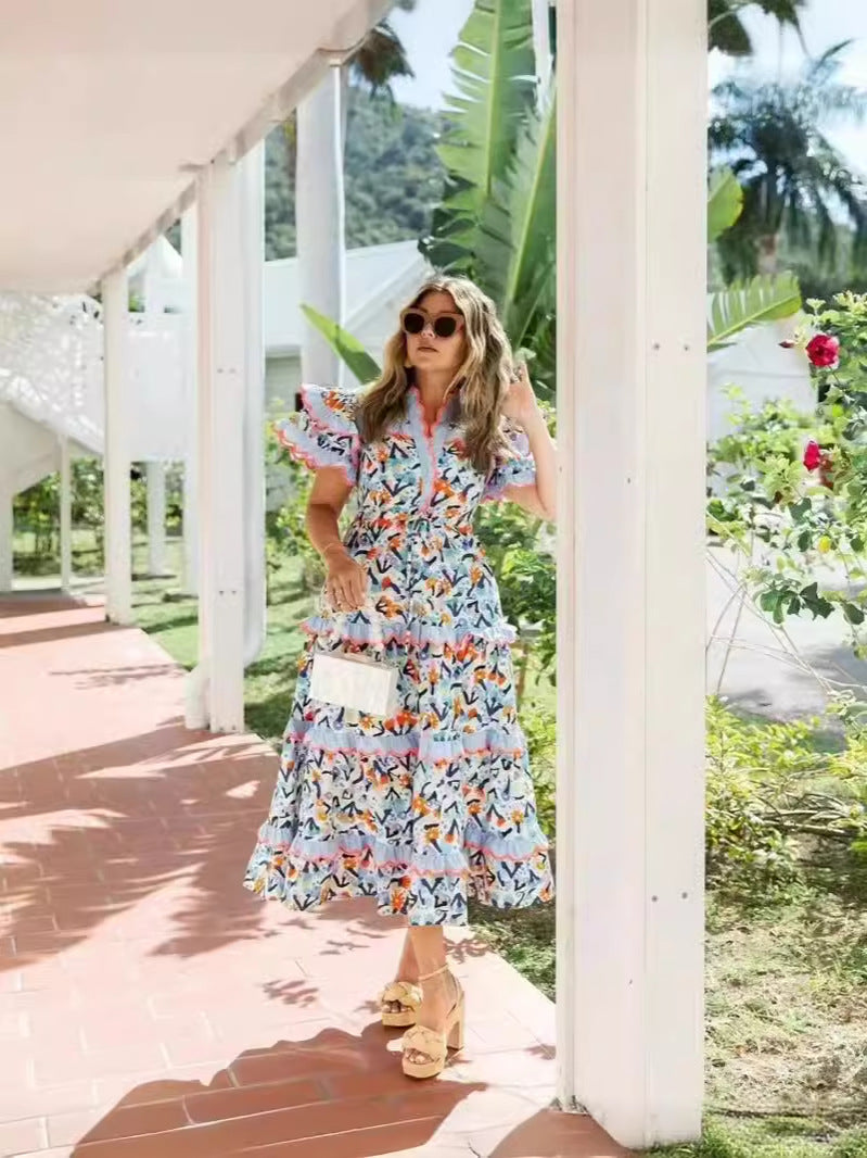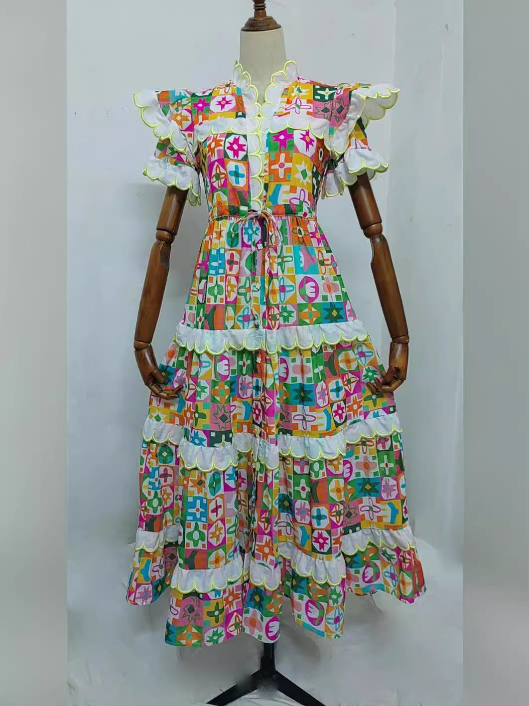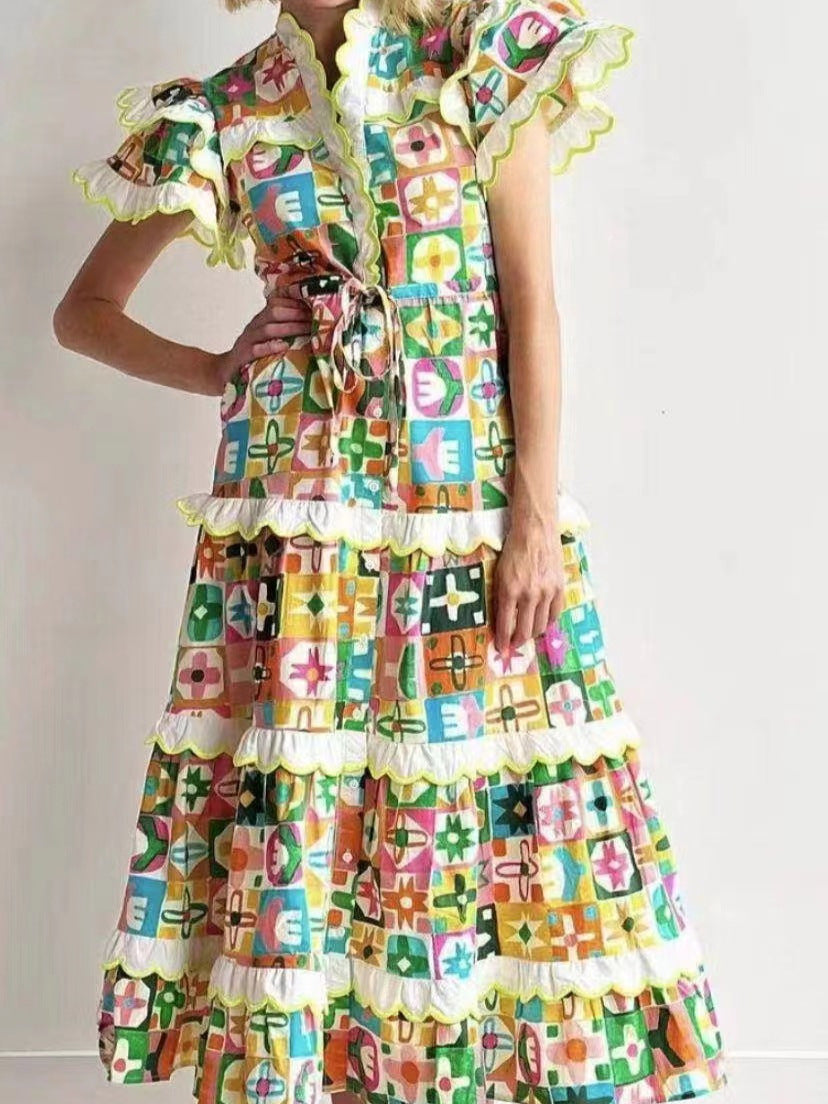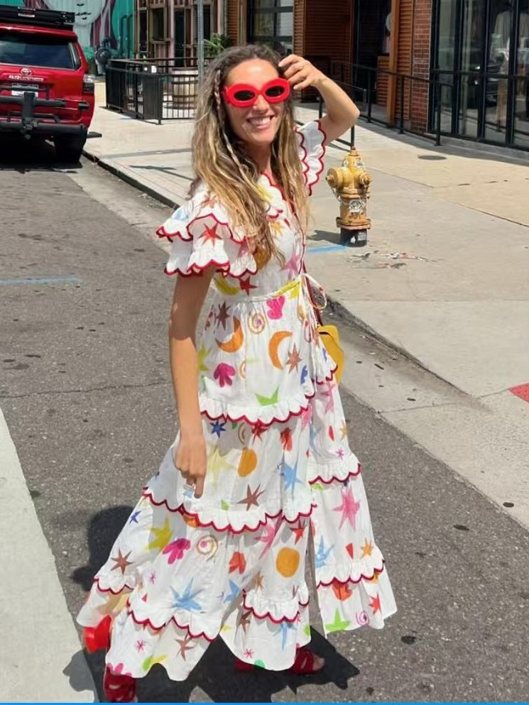 Dadizhimu Spring And Summer Australian National Wind Wave Side Lead Flying Sleeves Short-Sleeved Rope Waist Color Printed Dress