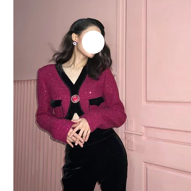 Dadizhimu Temperament Famous Fascling Woven Heavy Industry Flash Drill Buckle Retro Coat Woman Black Trousers