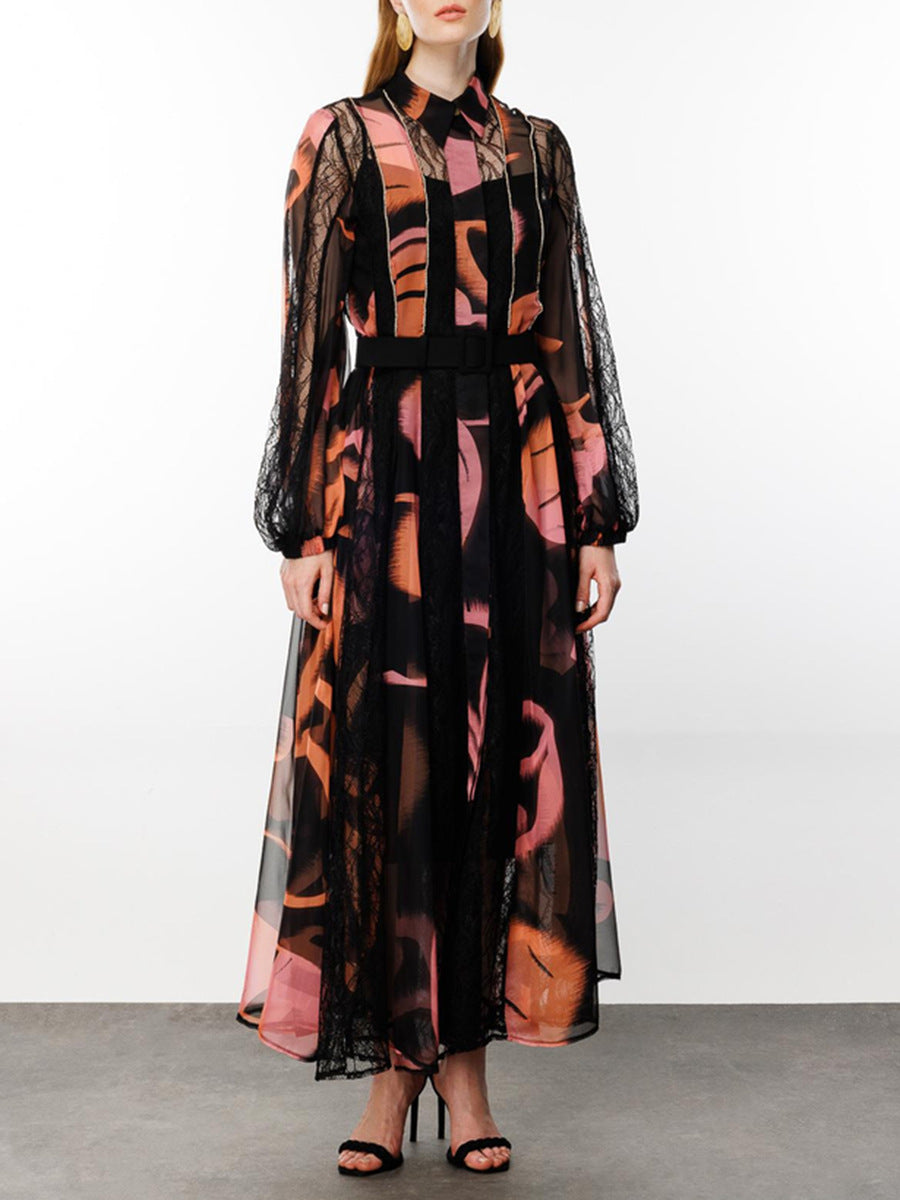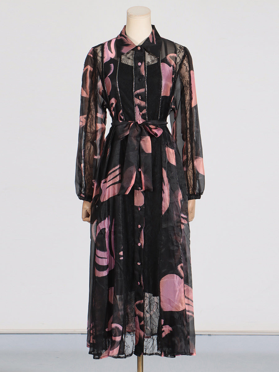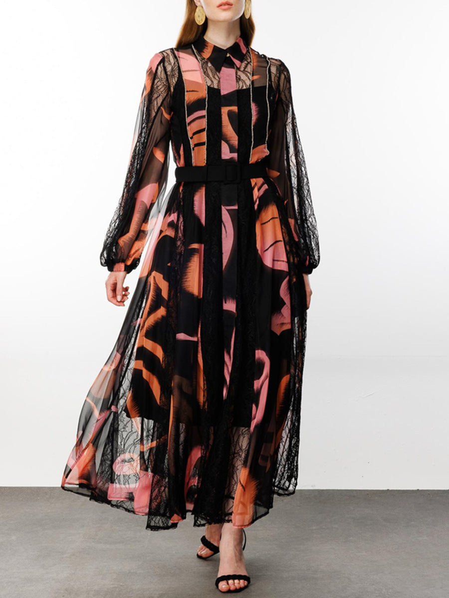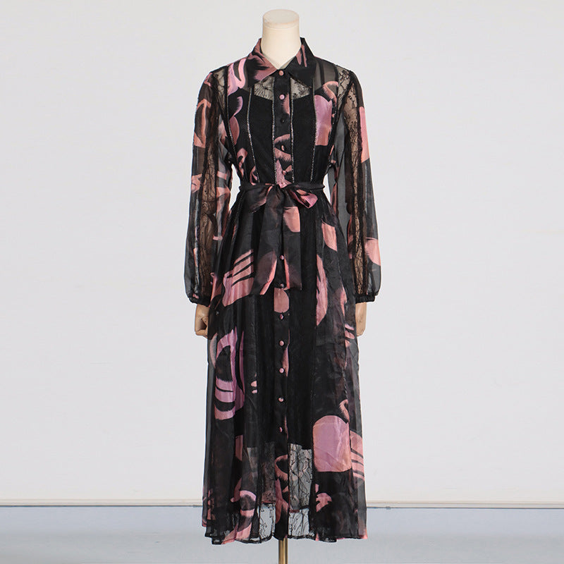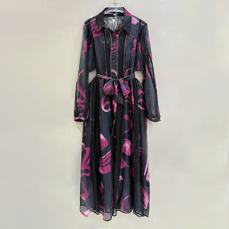 Dadizhimu Temperament Waist Display Thin Dress 2025 New Collar Printing Design Lace Long Dress Dress Women's Summer