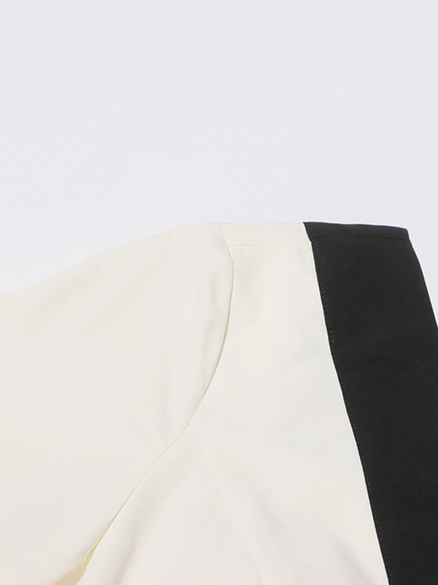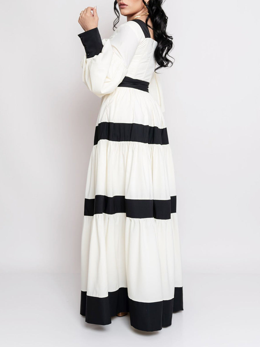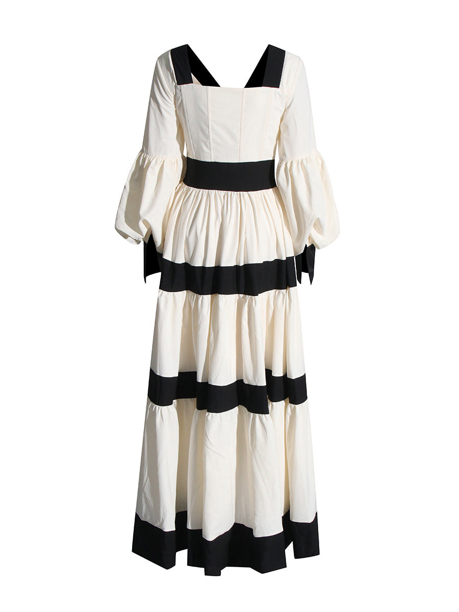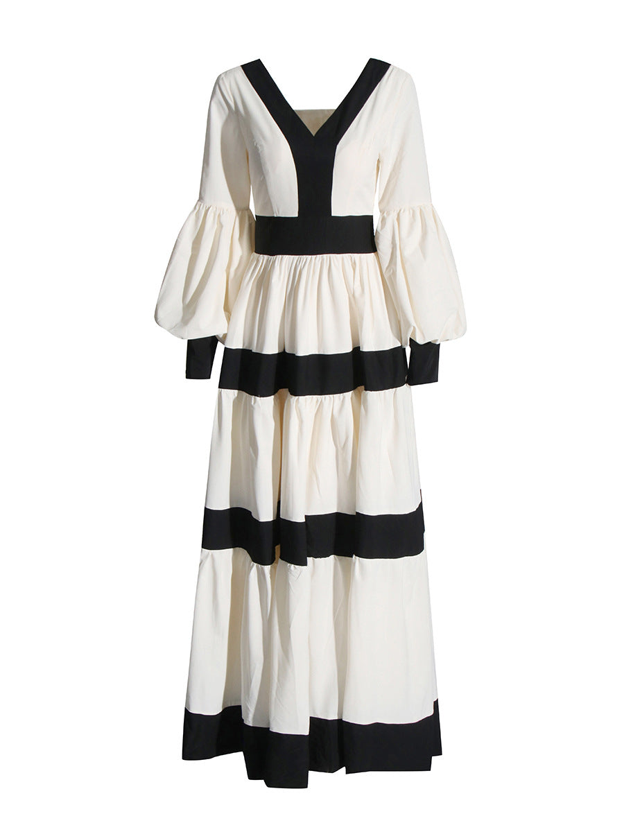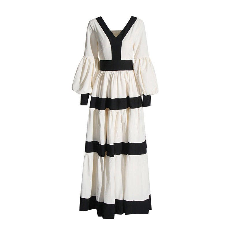 Dadizhimu V-Neck Lantern Sleeve Dress 2025 New Niche Colliding Color Design Long-Term Waist Dress Women's Summer