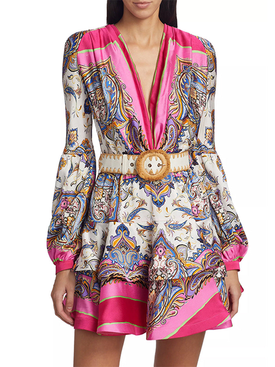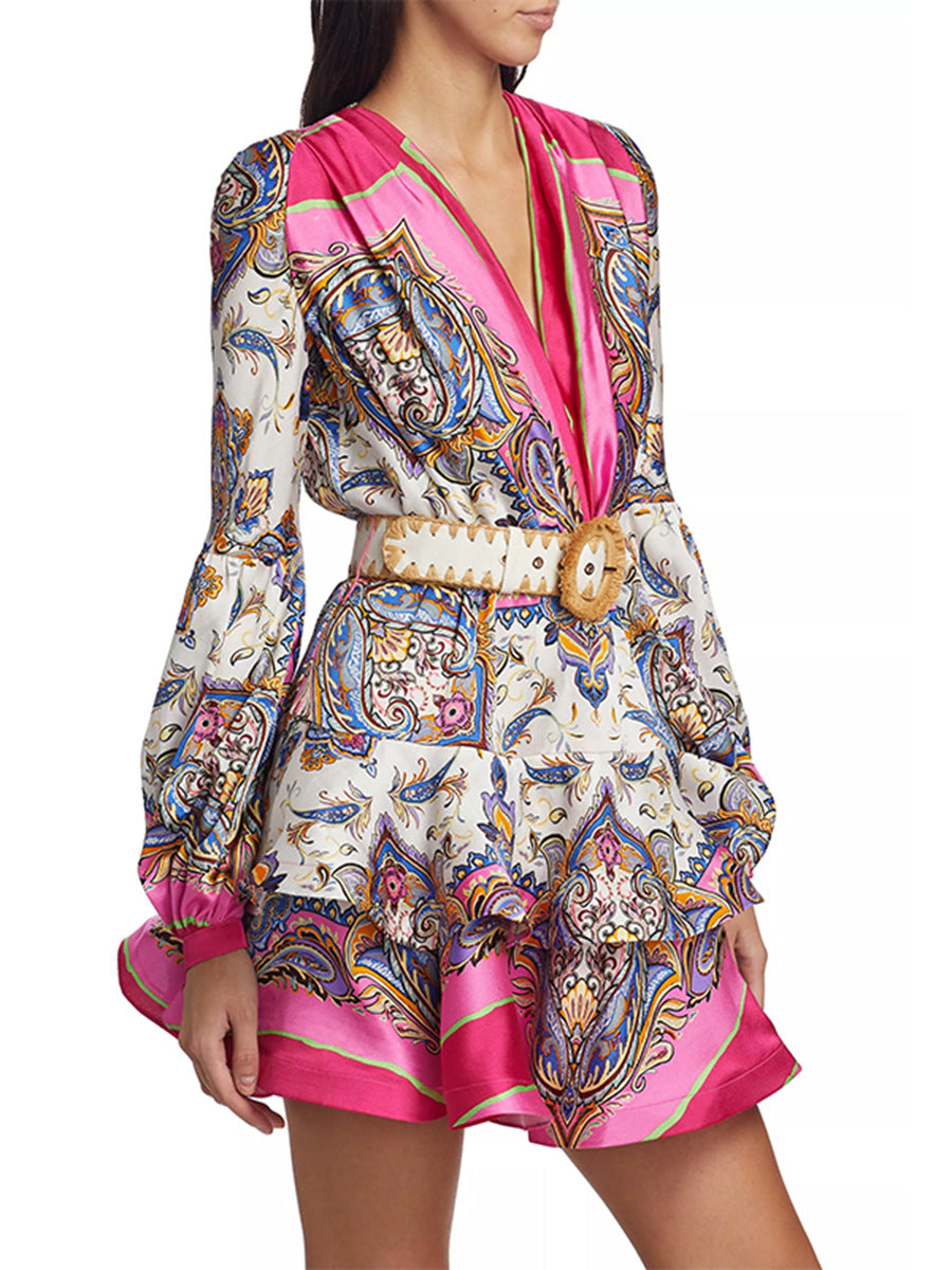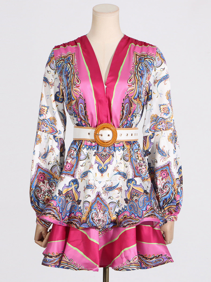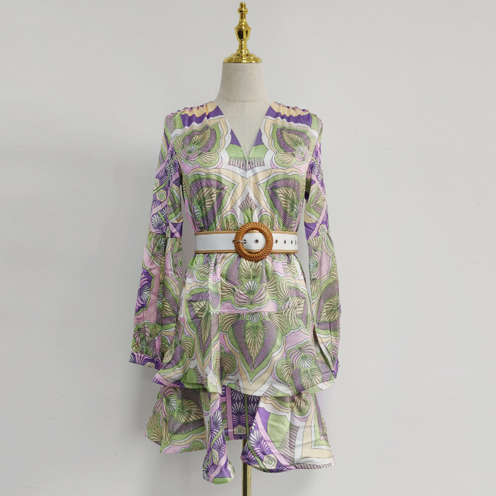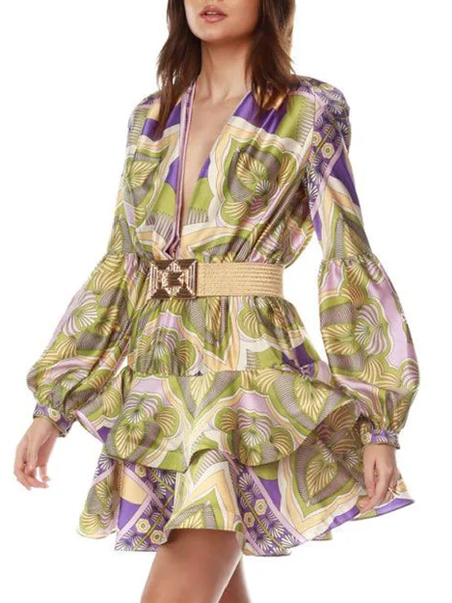 Dadizhimu Wind Print Lotus Leaf-Side Dress 2025 Summer New V-Neck Lantern Sleeves To Close The Waist Thin Skirt Woman