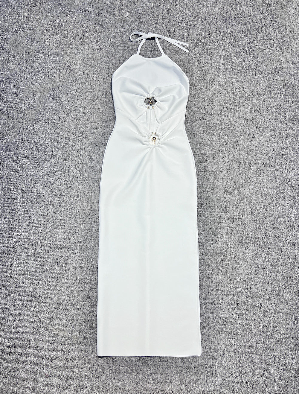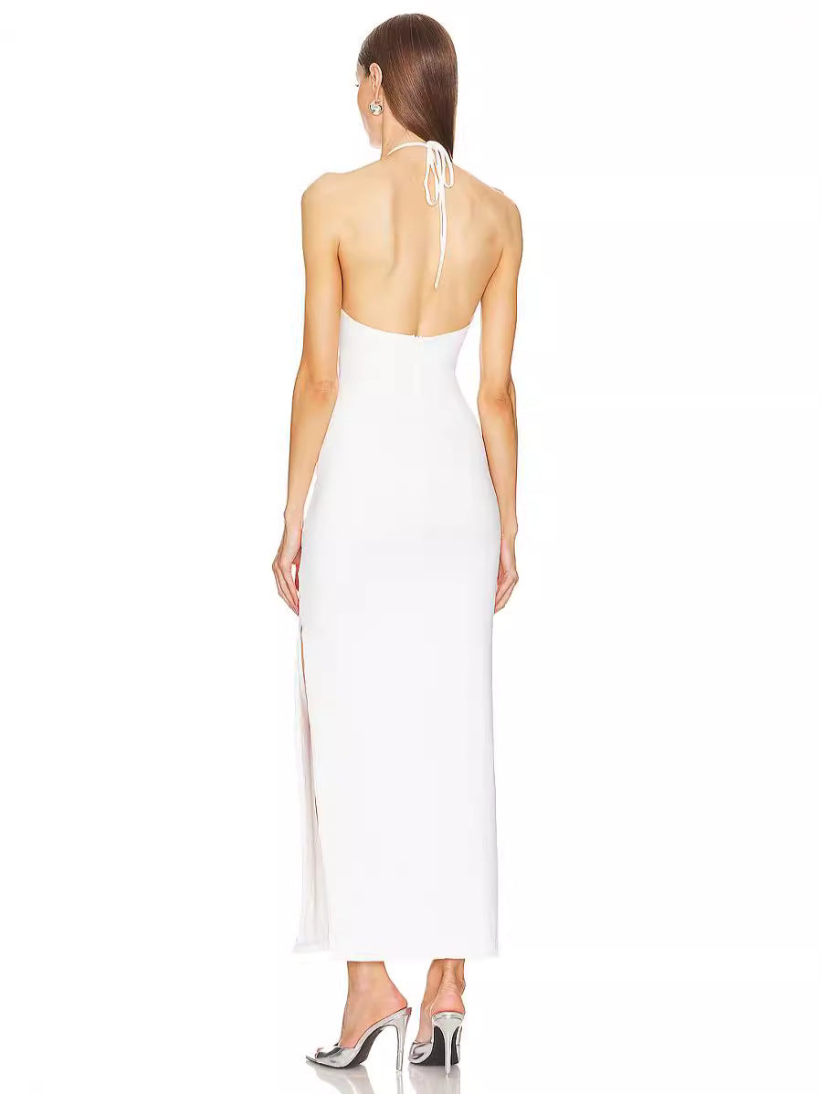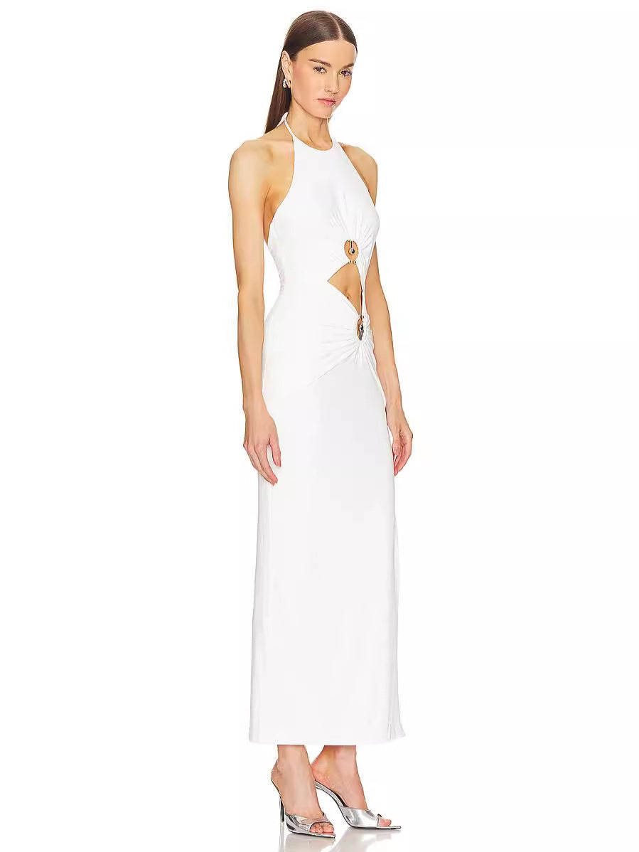 Dadizhimu Women's Sexy Hanging Neck-Laught White Long Skirt Ring Hollow Banding Dress