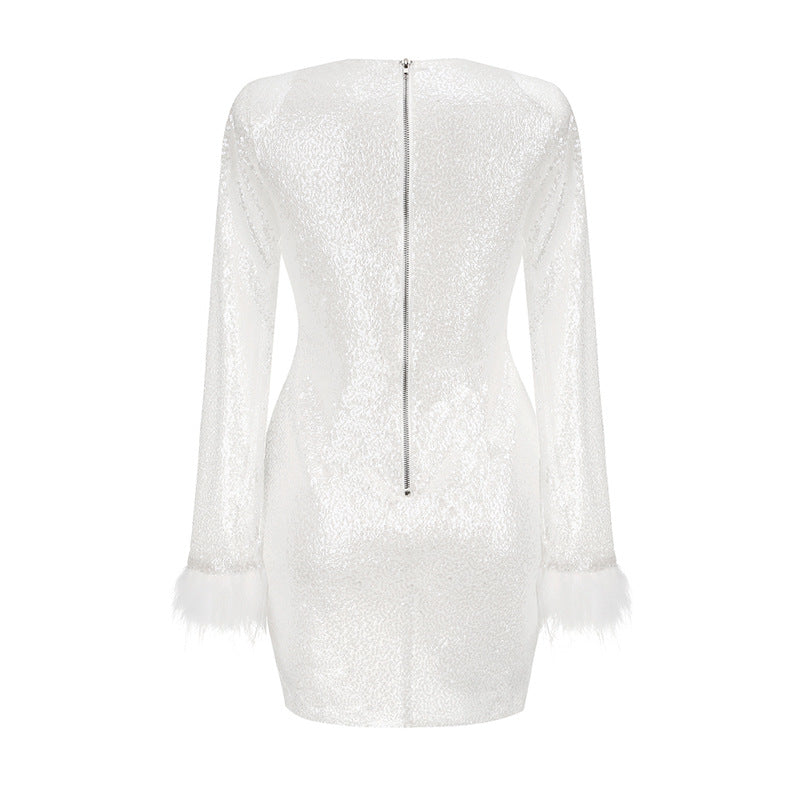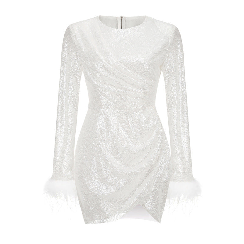 Dadizhimu Women's Sleeves Decorated Feather Dress Embellished Irregular Elegant Dress Woman